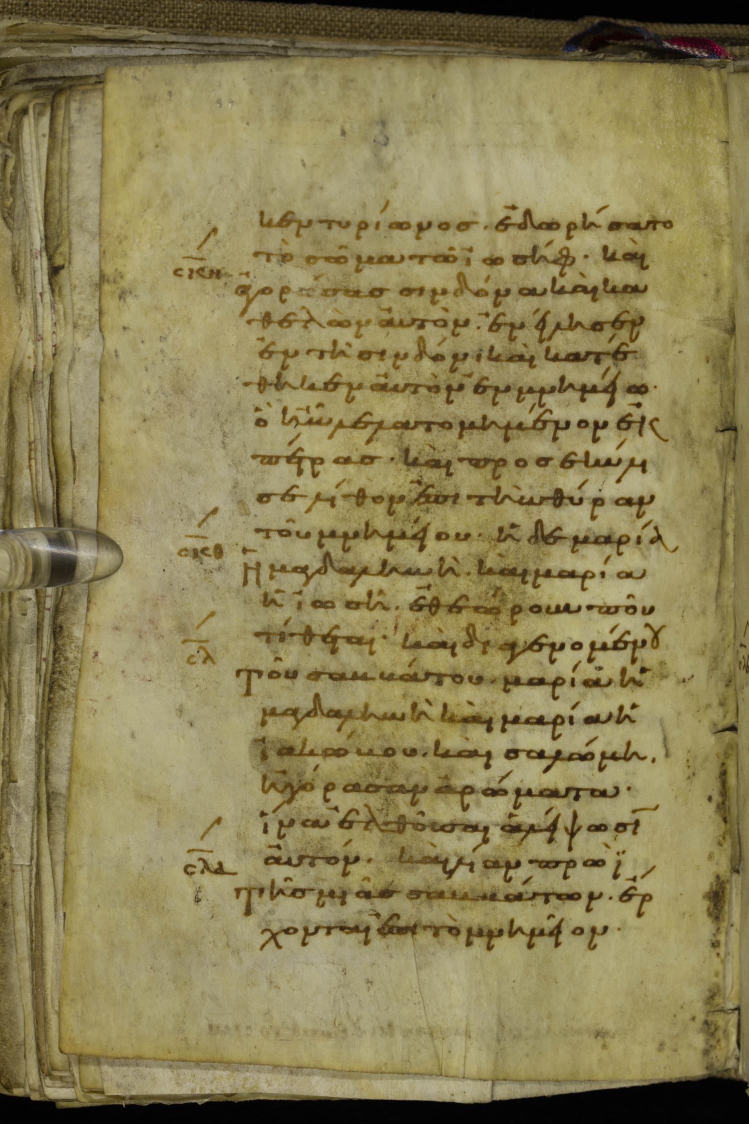 Tenth century minuscule of the Gospels on parchment; 220 leaves, 1 column, 20-21 lines per column. Images were taken at the National Library of Greece in Athens.