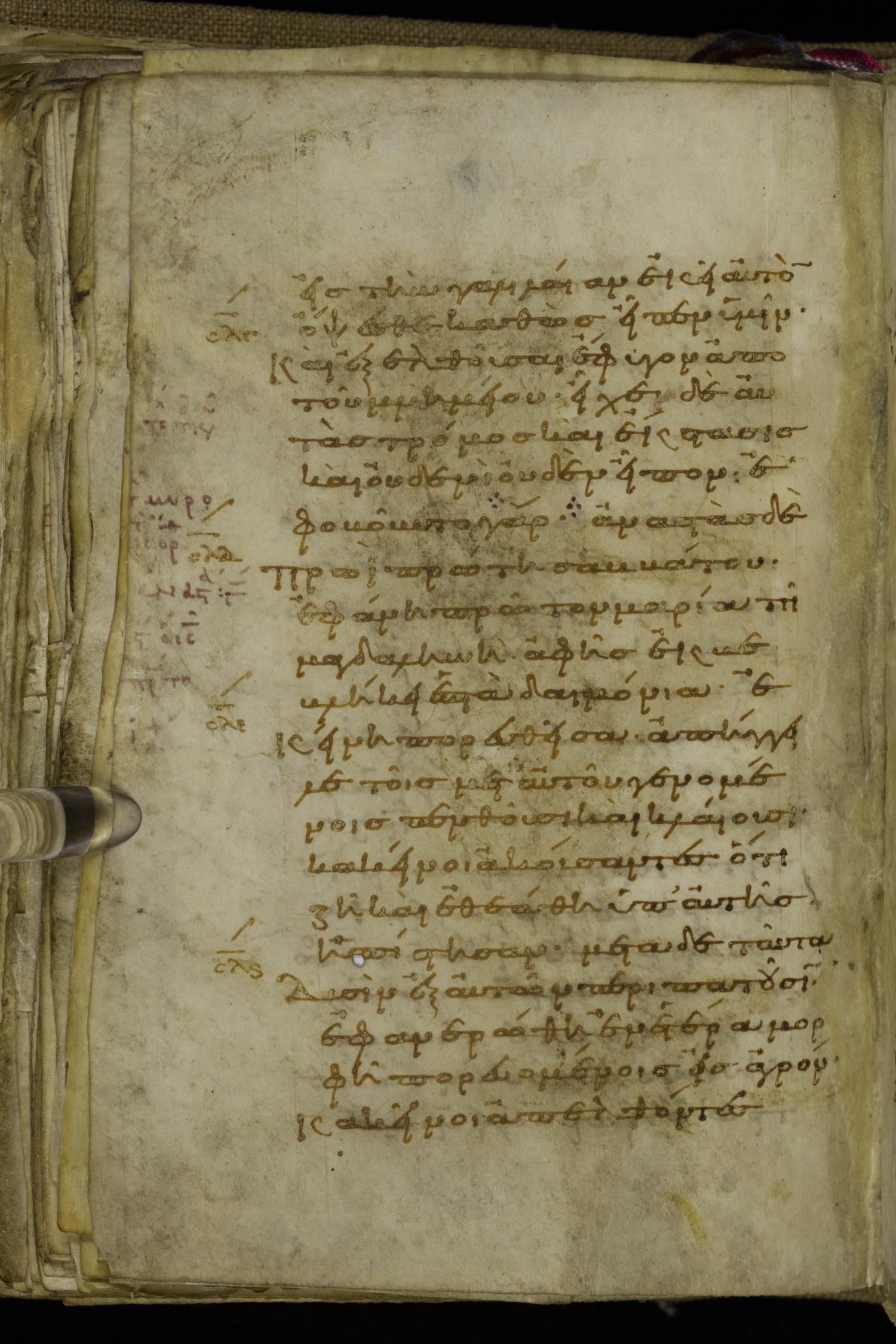Tenth century minuscule of the Gospels on parchment; 220 leaves, 1 column, 20-21 lines per column. Images were taken at the National Library of Greece in Athens.