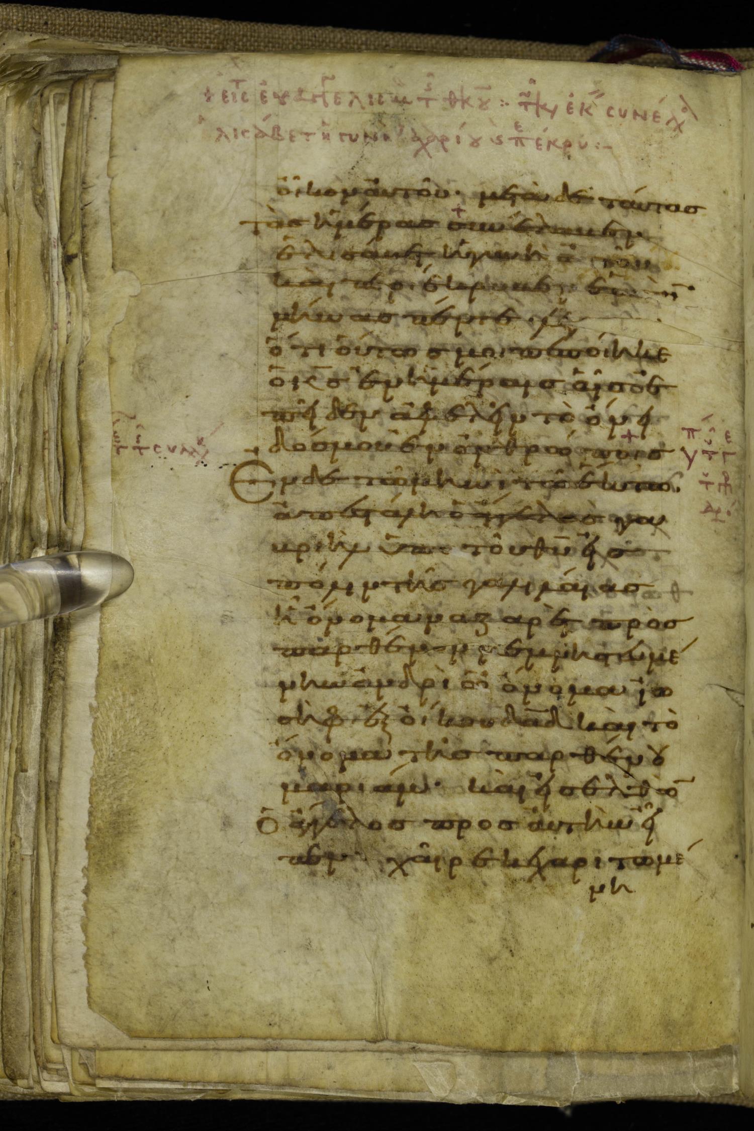 Tenth century minuscule of the Gospels on parchment; 220 leaves, 1 column, 20-21 lines per column. Images were taken at the National Library of Greece in Athens.