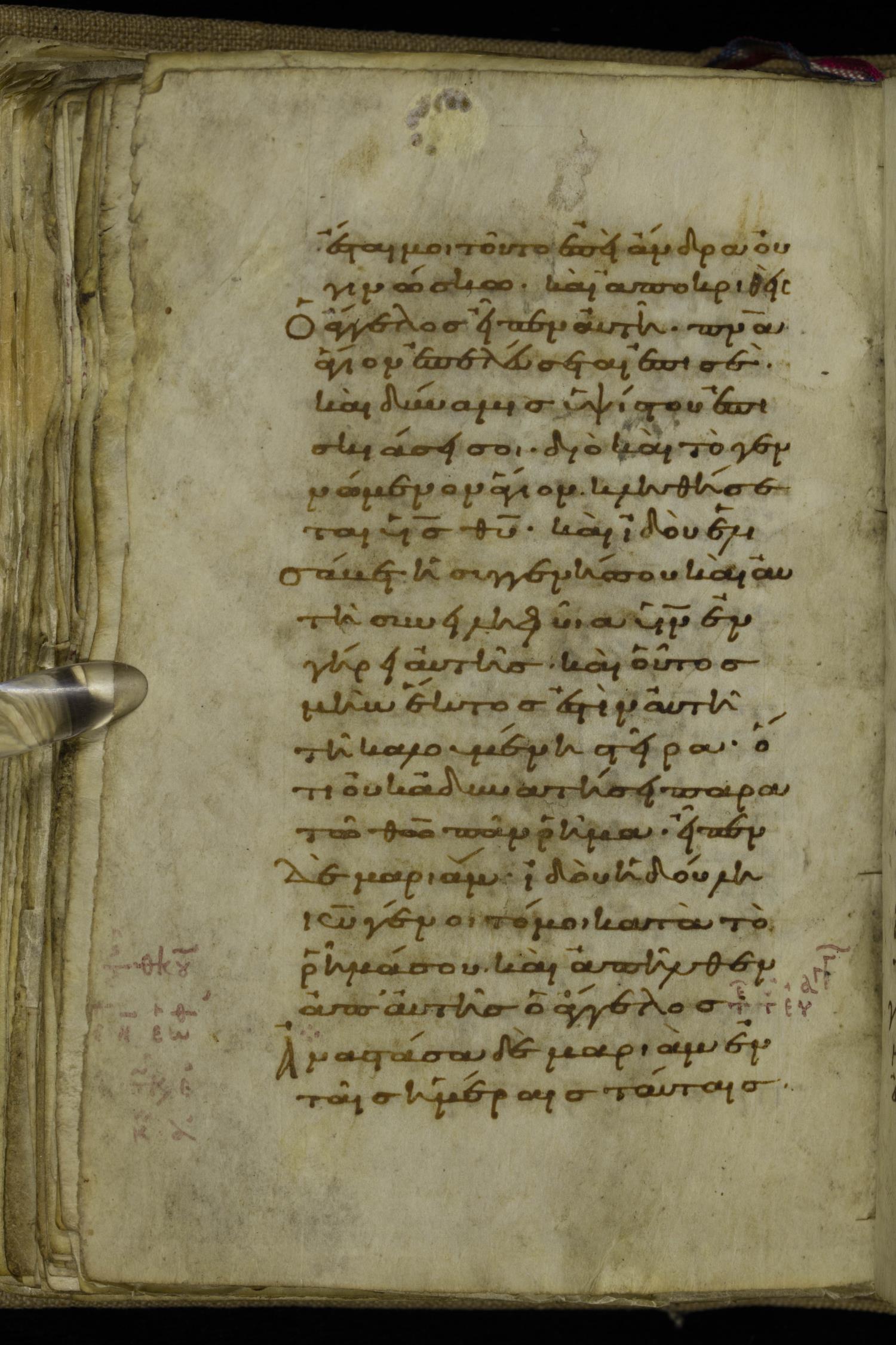 Tenth century minuscule of the Gospels on parchment; 220 leaves, 1 column, 20-21 lines per column. Images were taken at the National Library of Greece in Athens.