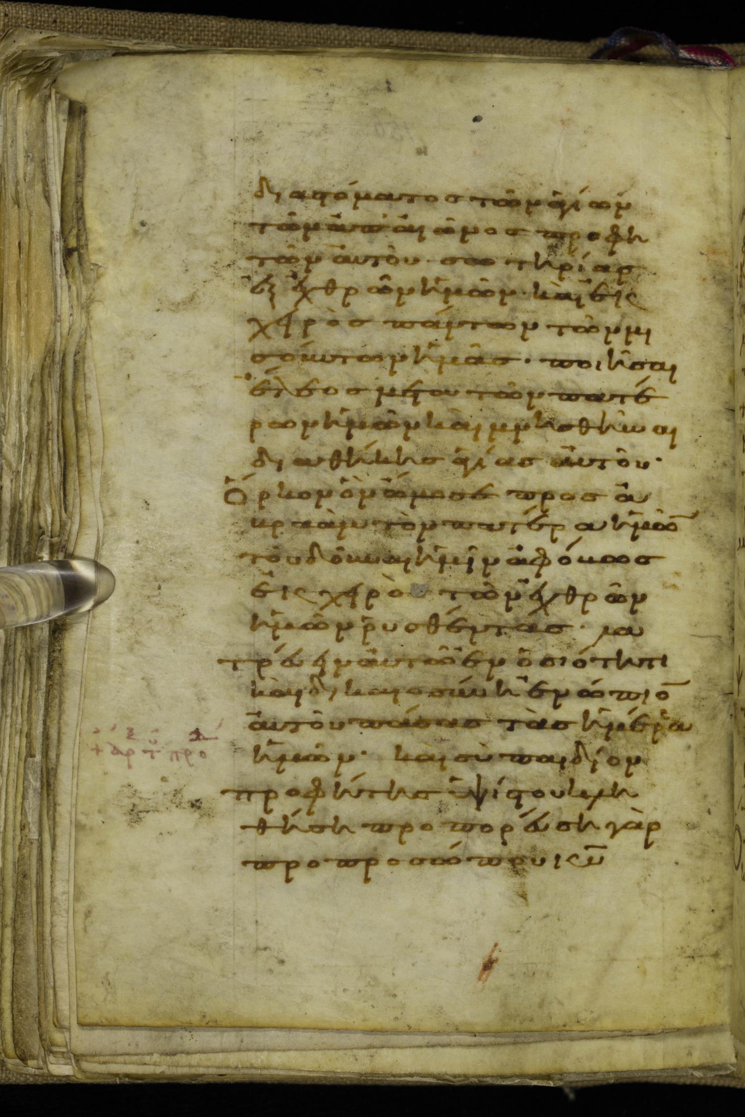 Tenth century minuscule of the Gospels on parchment; 220 leaves, 1 column, 20-21 lines per column. Images were taken at the National Library of Greece in Athens.
