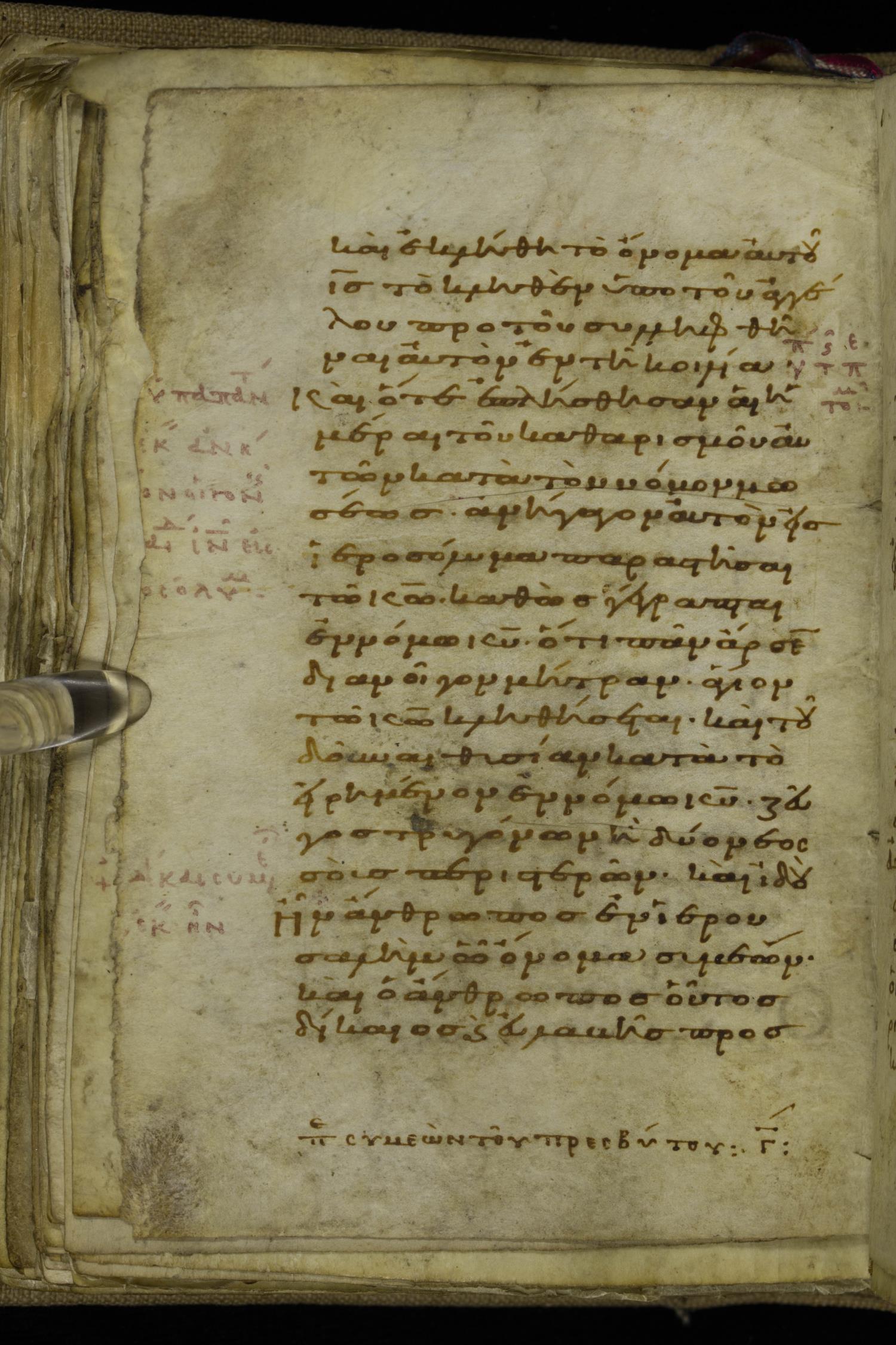 Tenth century minuscule of the Gospels on parchment; 220 leaves, 1 column, 20-21 lines per column. Images were taken at the National Library of Greece in Athens.