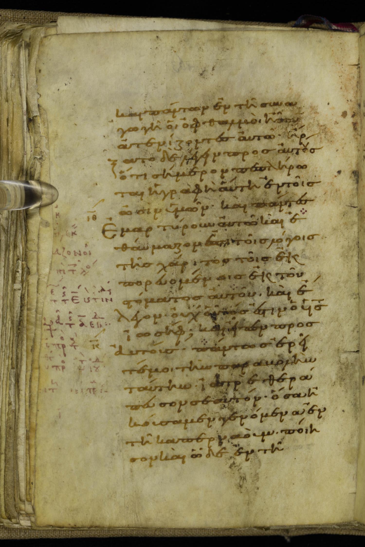 Tenth century minuscule of the Gospels on parchment; 220 leaves, 1 column, 20-21 lines per column. Images were taken at the National Library of Greece in Athens.