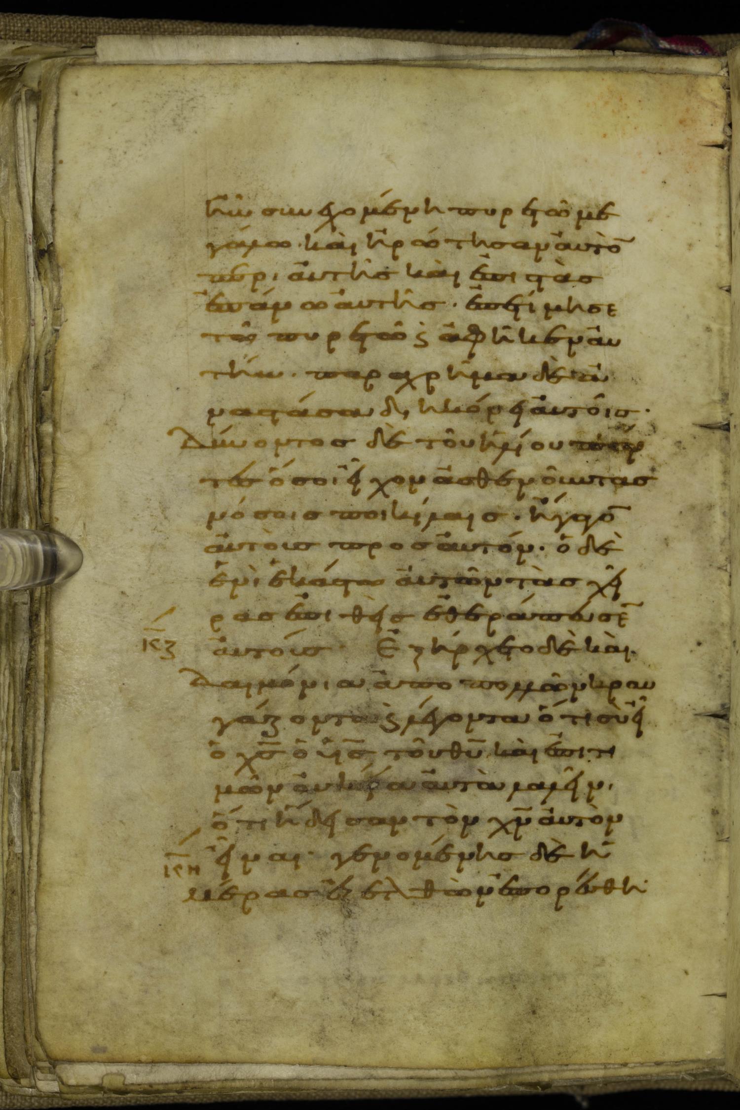 Tenth century minuscule of the Gospels on parchment; 220 leaves, 1 column, 20-21 lines per column. Images were taken at the National Library of Greece in Athens.