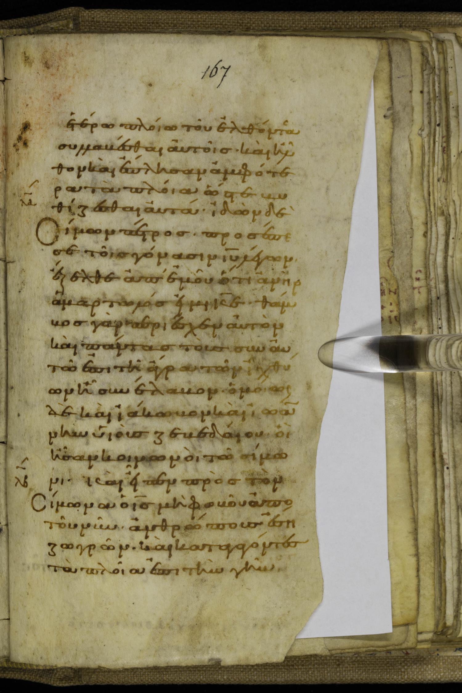 Tenth century minuscule of the Gospels on parchment; 220 leaves, 1 column, 20-21 lines per column. Images were taken at the National Library of Greece in Athens.