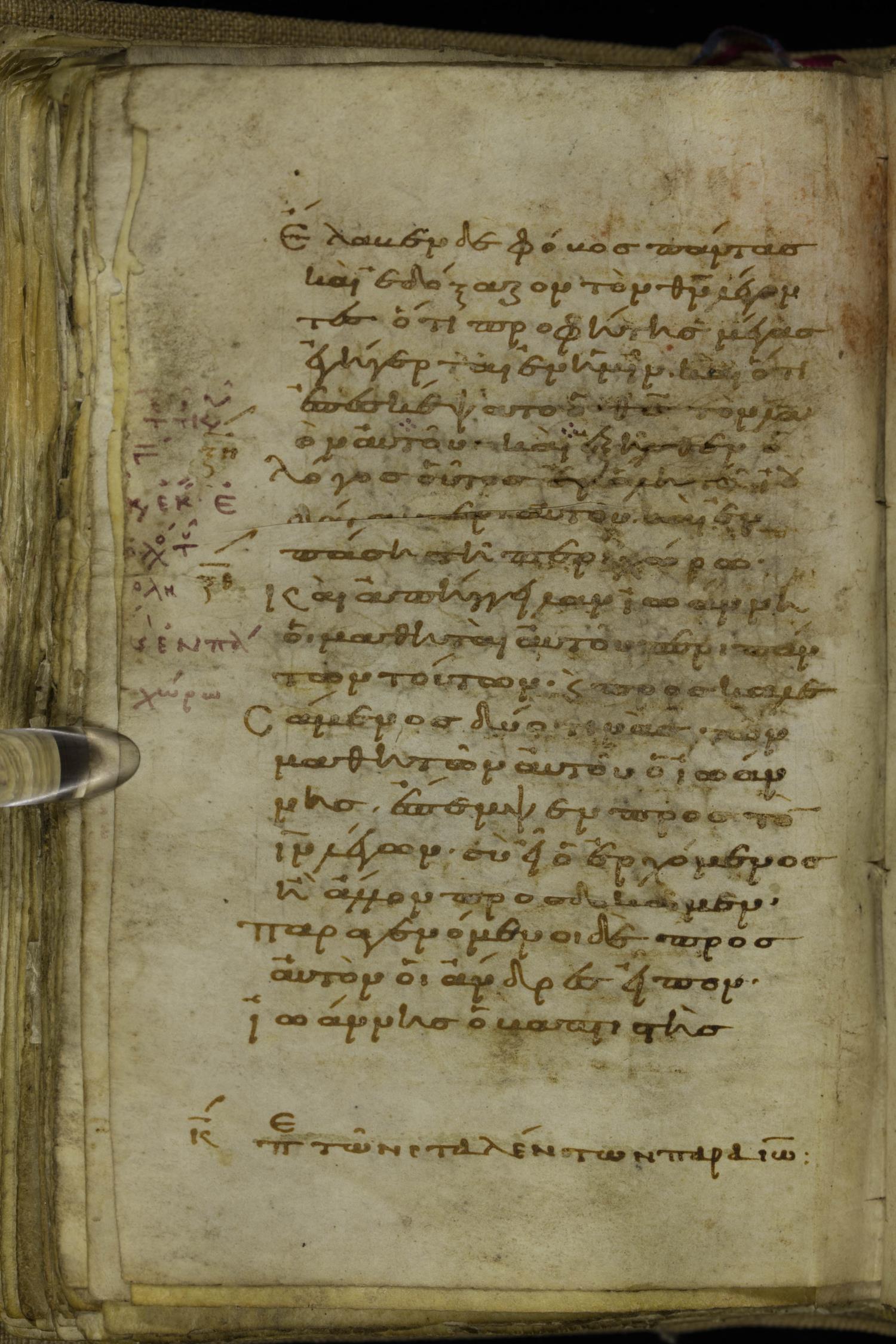 Tenth century minuscule of the Gospels on parchment; 220 leaves, 1 column, 20-21 lines per column. Images were taken at the National Library of Greece in Athens.