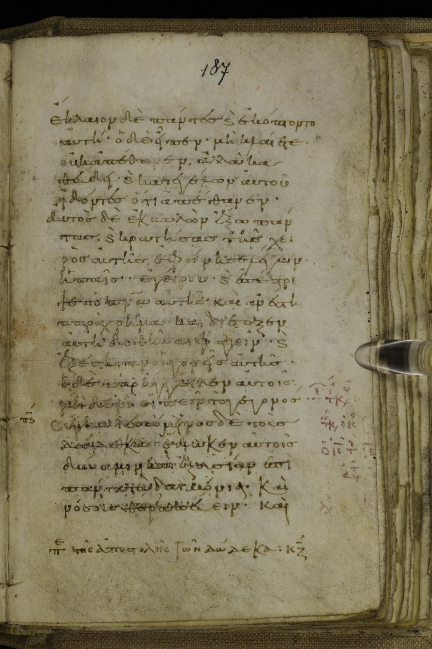 Tenth century minuscule of the Gospels on parchment; 220 leaves, 1 column, 20-21 lines per column. Images were taken at the National Library of Greece in Athens.