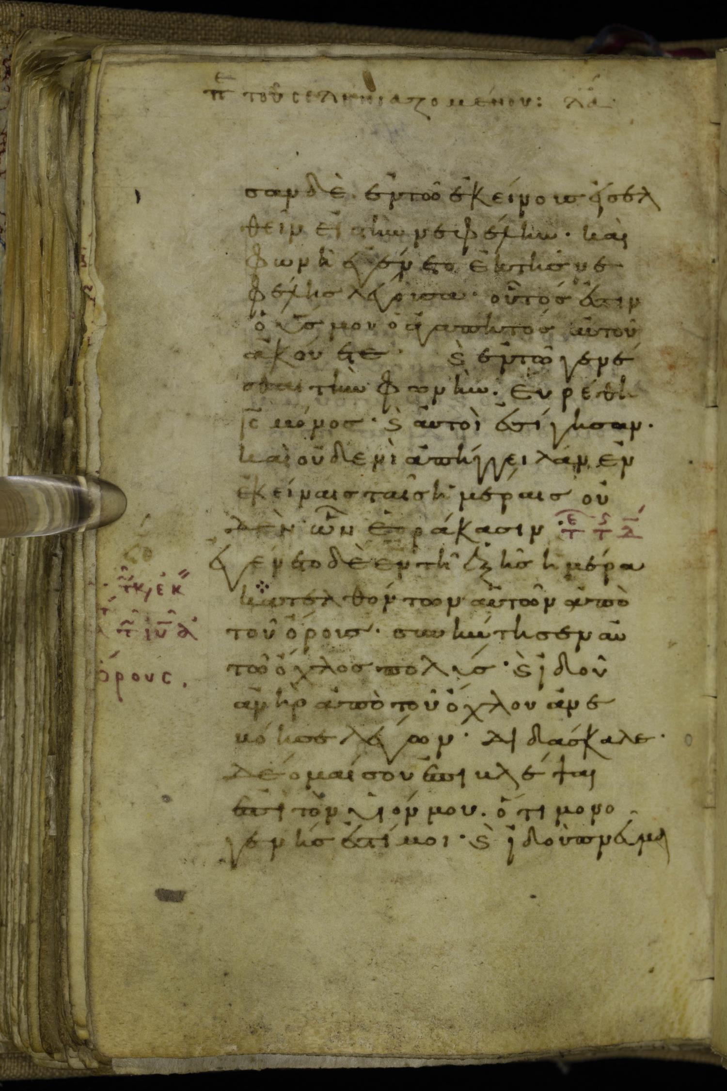 Tenth century minuscule of the Gospels on parchment; 220 leaves, 1 column, 20-21 lines per column. Images were taken at the National Library of Greece in Athens.