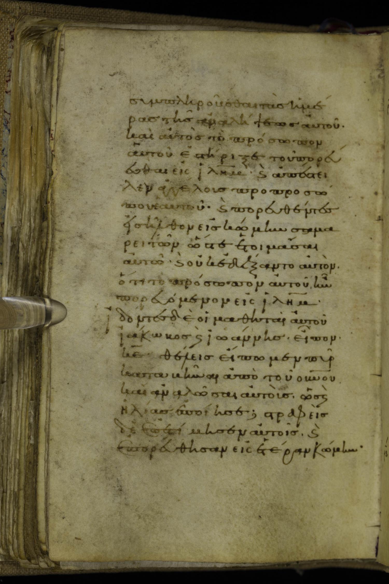 Tenth century minuscule of the Gospels on parchment; 220 leaves, 1 column, 20-21 lines per column. Images were taken at the National Library of Greece in Athens.