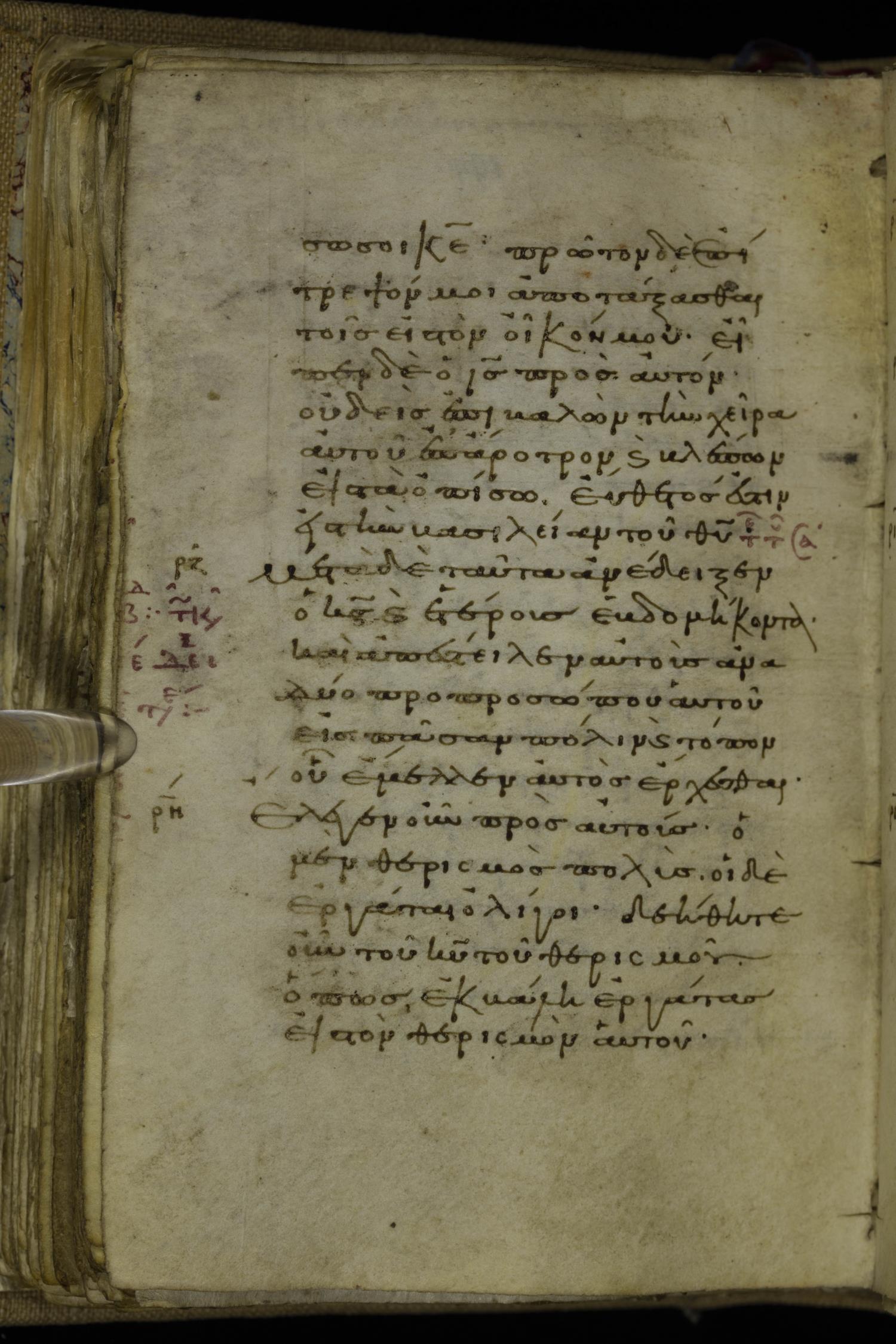 Tenth century minuscule of the Gospels on parchment; 220 leaves, 1 column, 20-21 lines per column. Images were taken at the National Library of Greece in Athens.