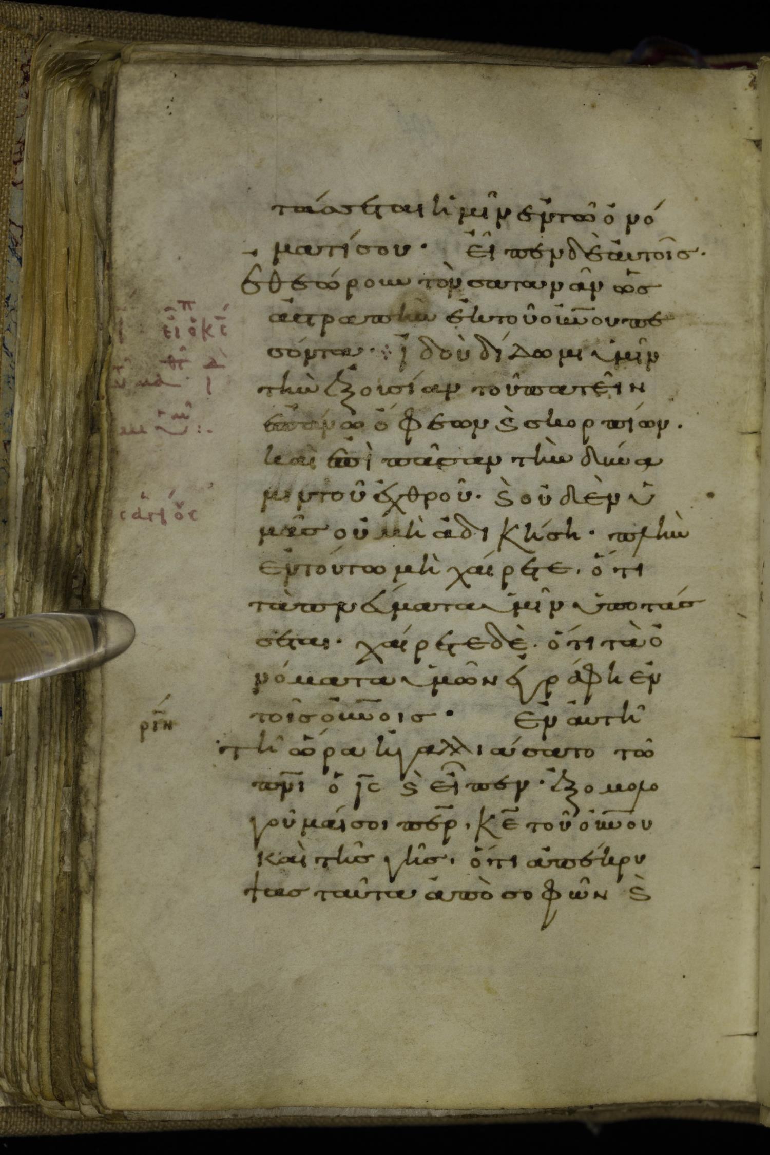Tenth century minuscule of the Gospels on parchment; 220 leaves, 1 column, 20-21 lines per column. Images were taken at the National Library of Greece in Athens.