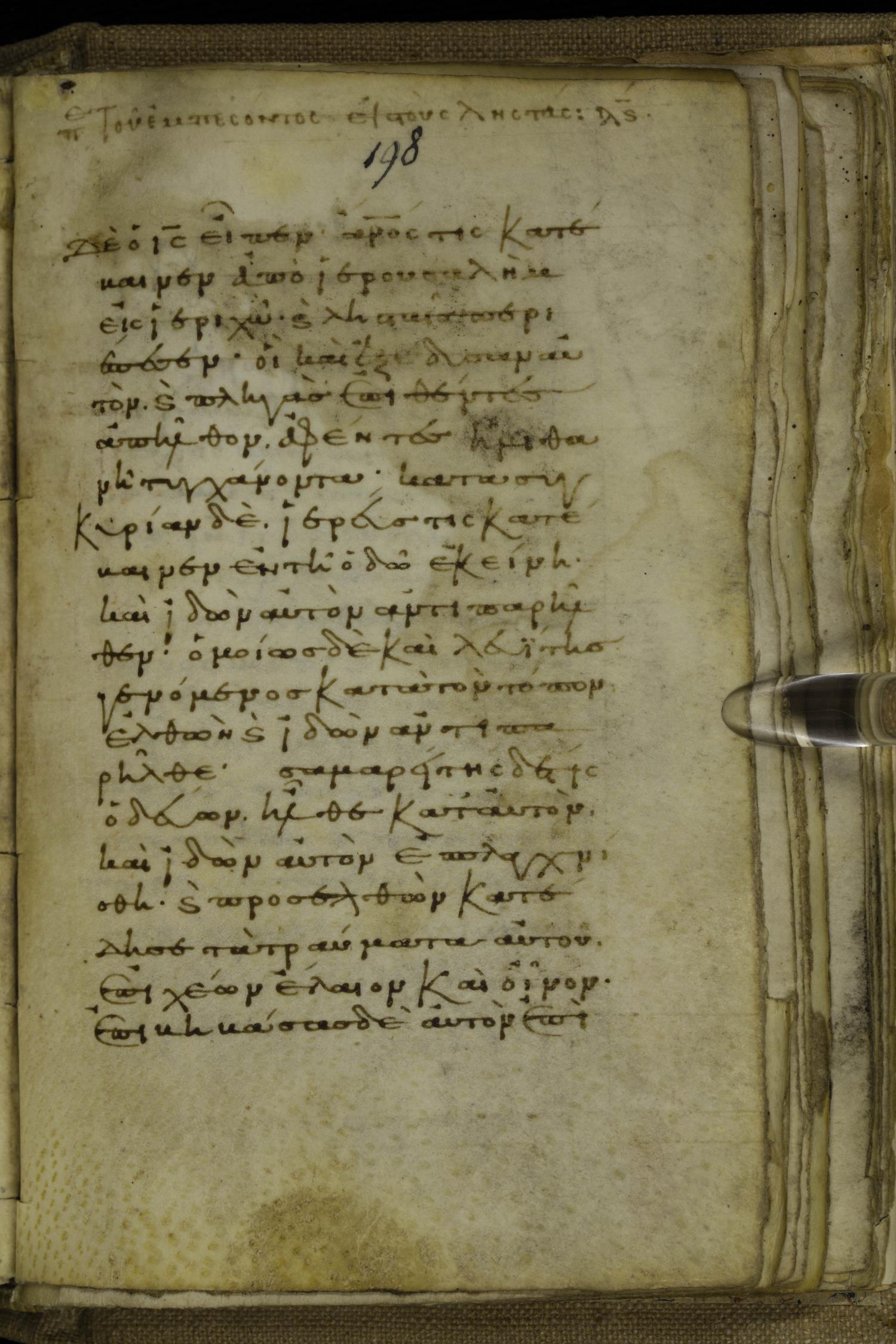 Tenth century minuscule of the Gospels on parchment; 220 leaves, 1 column, 20-21 lines per column. Images were taken at the National Library of Greece in Athens.