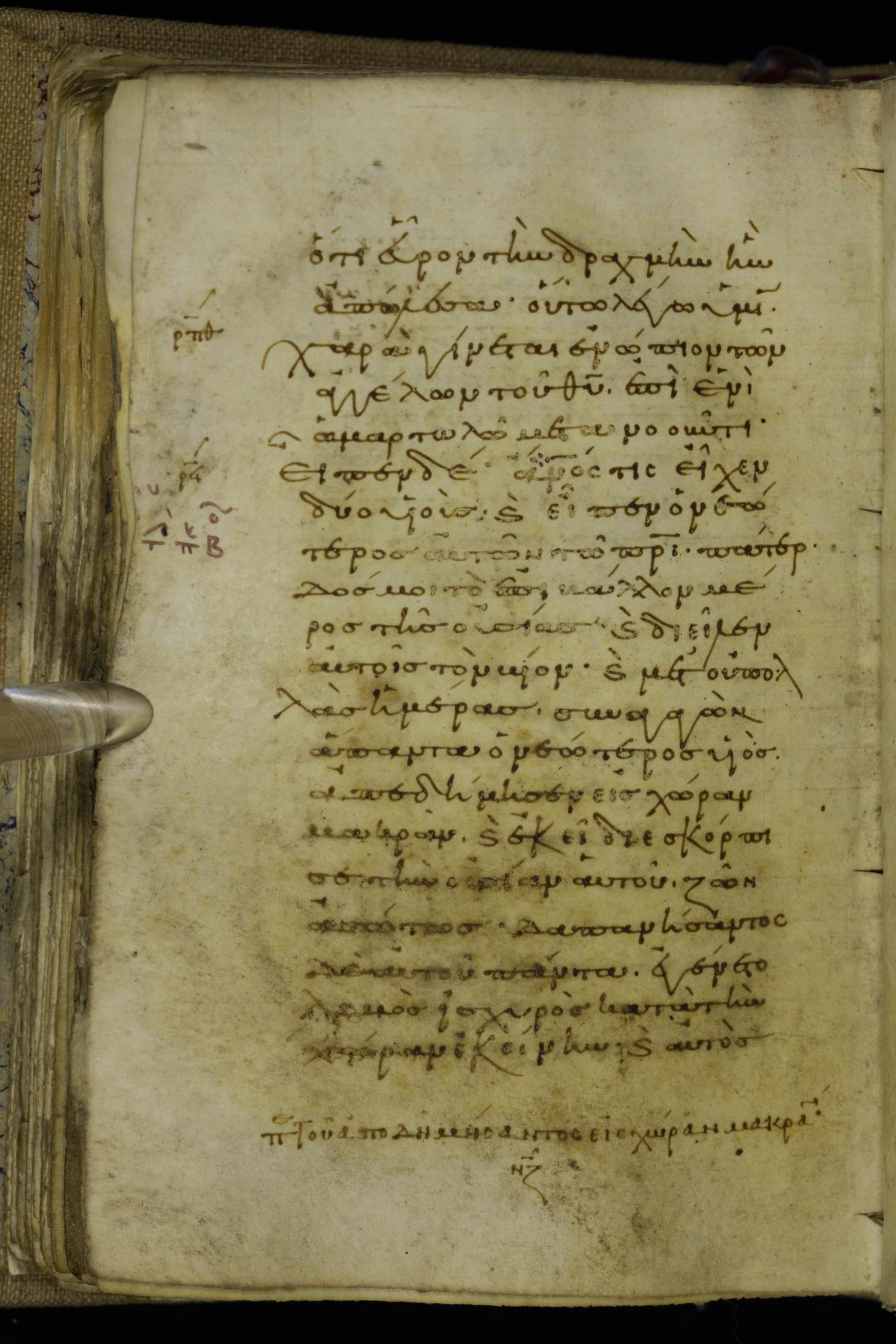 Tenth century minuscule of the Gospels on parchment; 220 leaves, 1 column, 20-21 lines per column. Images were taken at the National Library of Greece in Athens.