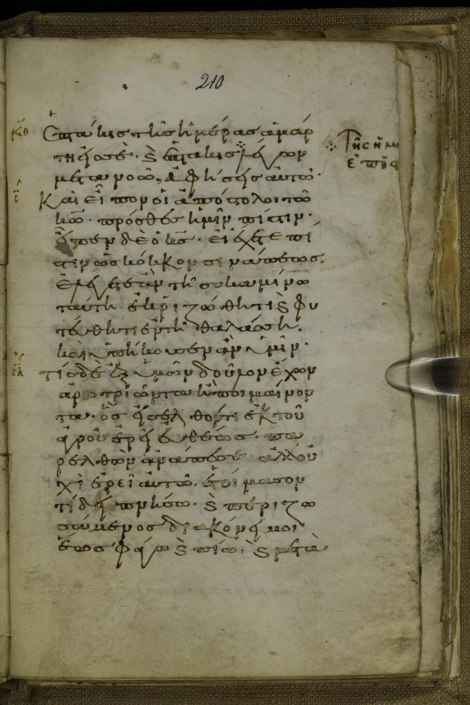 Tenth century minuscule of the Gospels on parchment; 220 leaves, 1 column, 20-21 lines per column. Images were taken at the National Library of Greece in Athens.