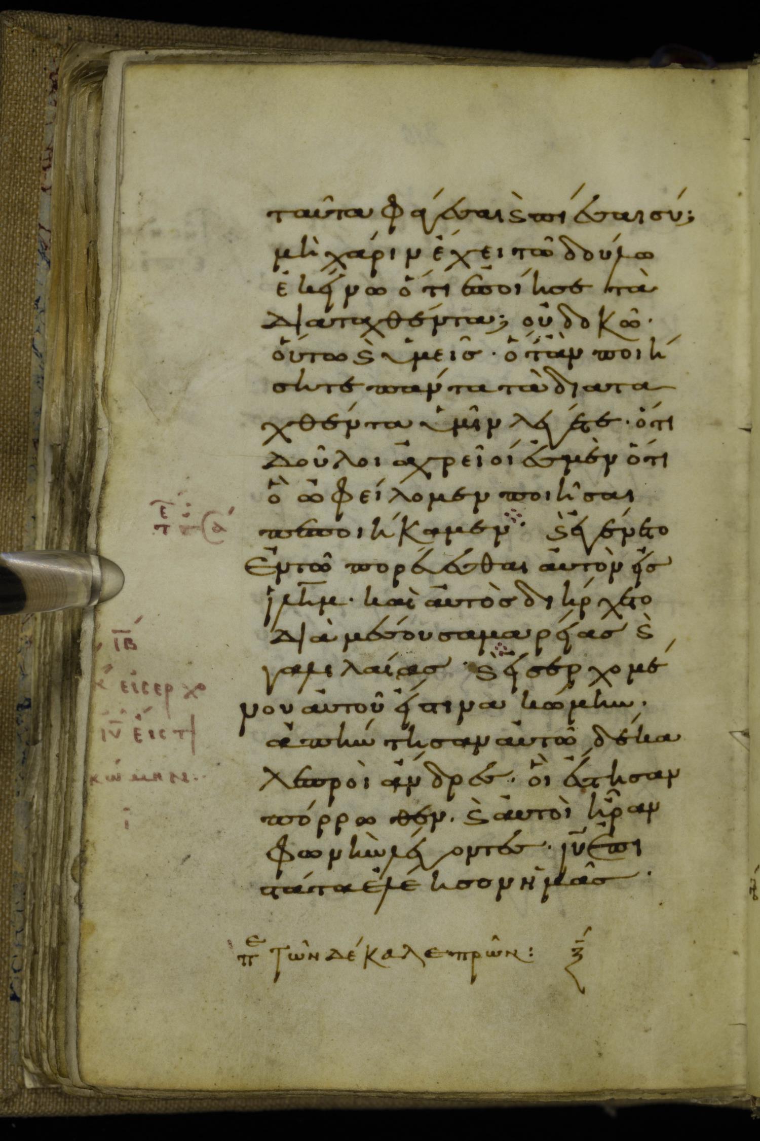 Tenth century minuscule of the Gospels on parchment; 220 leaves, 1 column, 20-21 lines per column. Images were taken at the National Library of Greece in Athens.