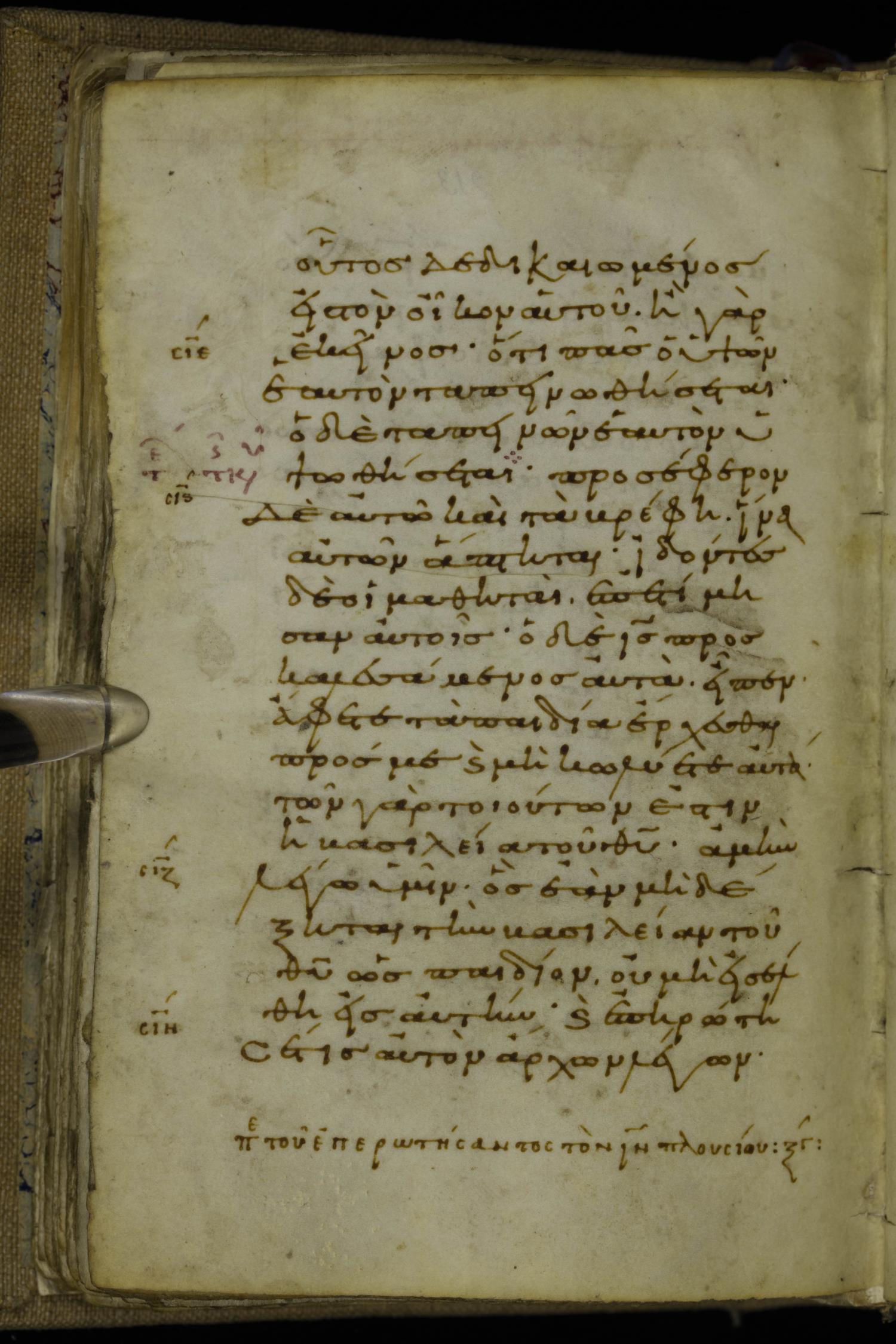 Tenth century minuscule of the Gospels on parchment; 220 leaves, 1 column, 20-21 lines per column. Images were taken at the National Library of Greece in Athens.