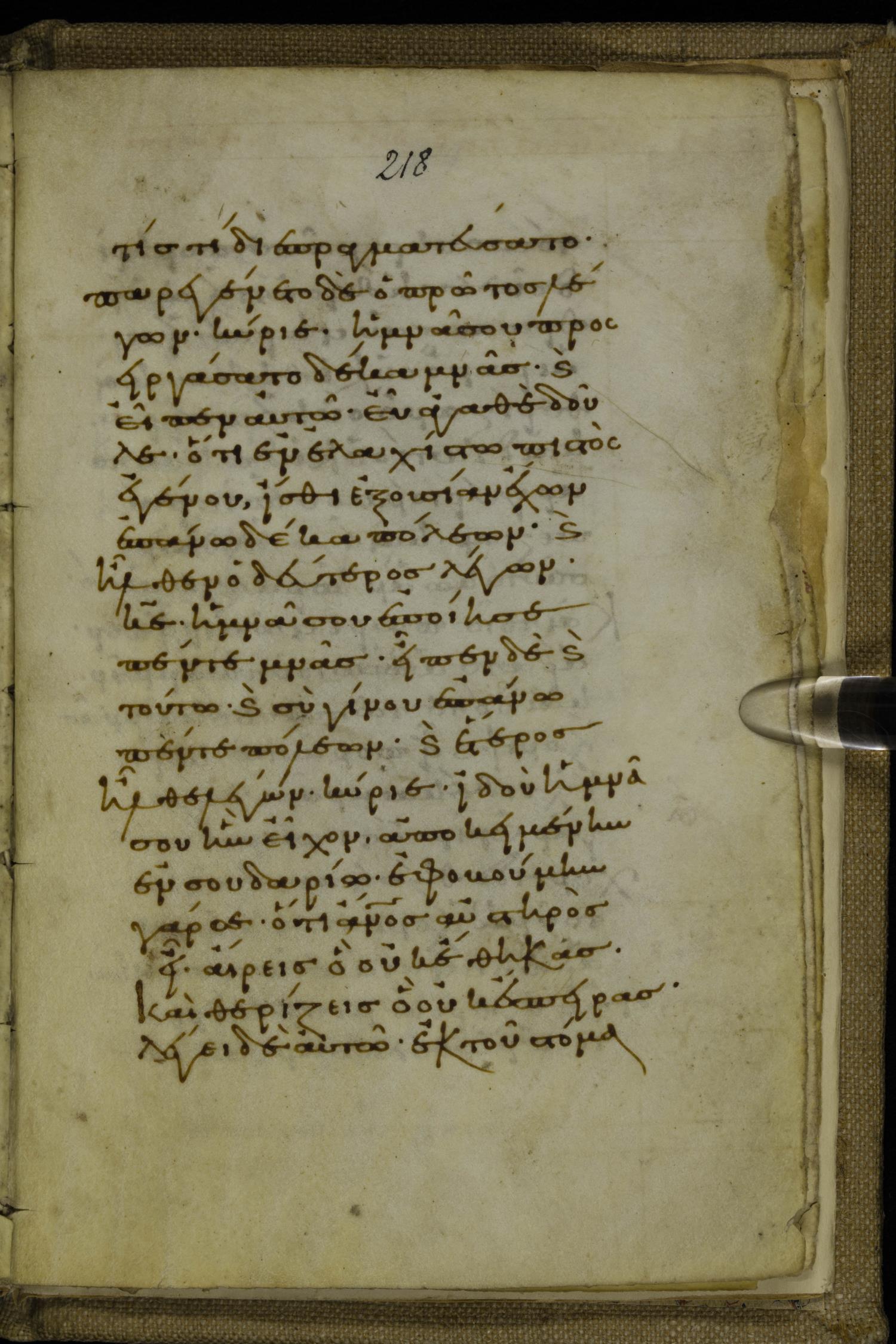 Tenth century minuscule of the Gospels on parchment; 220 leaves, 1 column, 20-21 lines per column. Images were taken at the National Library of Greece in Athens.