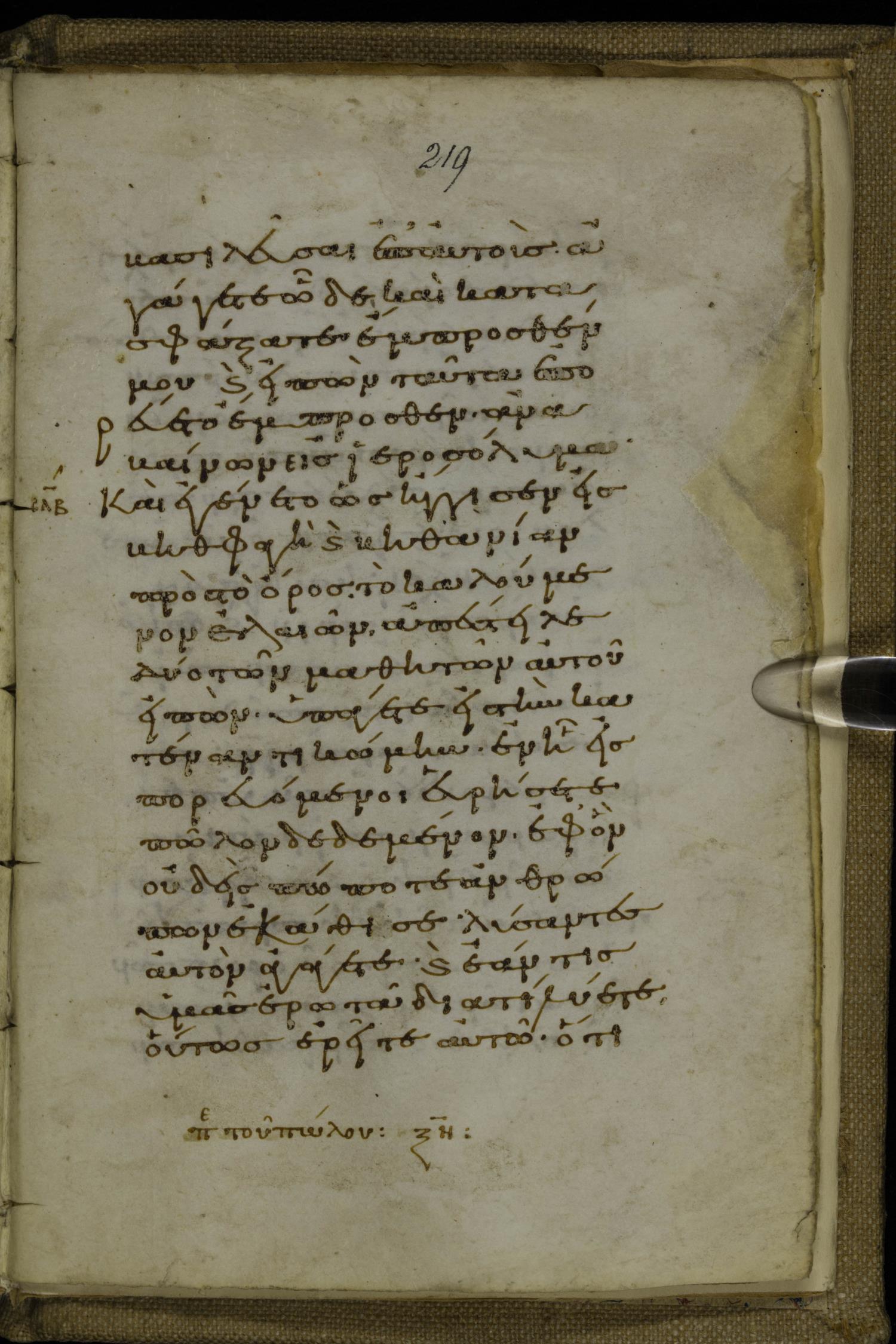 Tenth century minuscule of the Gospels on parchment; 220 leaves, 1 column, 20-21 lines per column. Images were taken at the National Library of Greece in Athens.