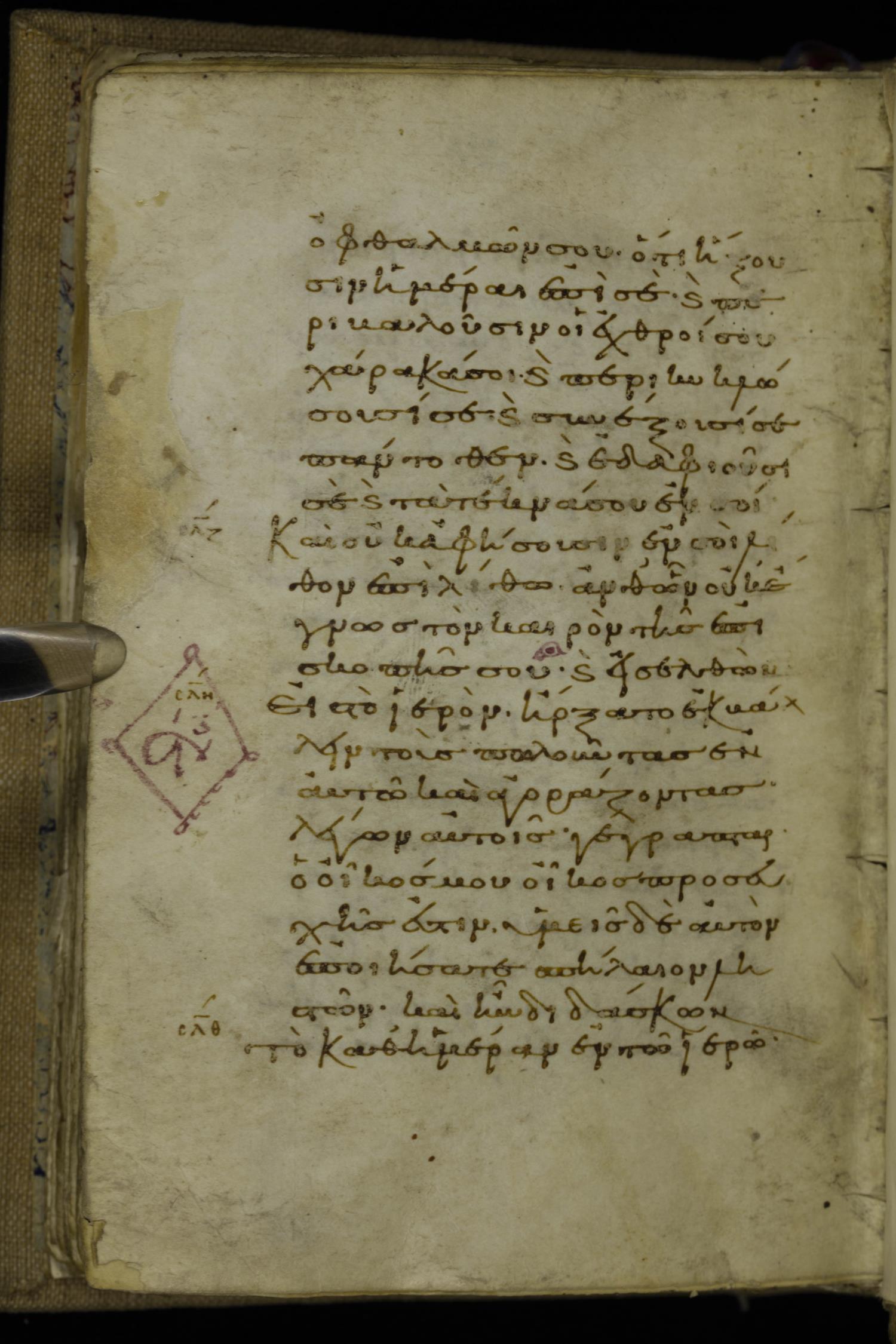 Tenth century minuscule of the Gospels on parchment; 220 leaves, 1 column, 20-21 lines per column. Images were taken at the National Library of Greece in Athens.
