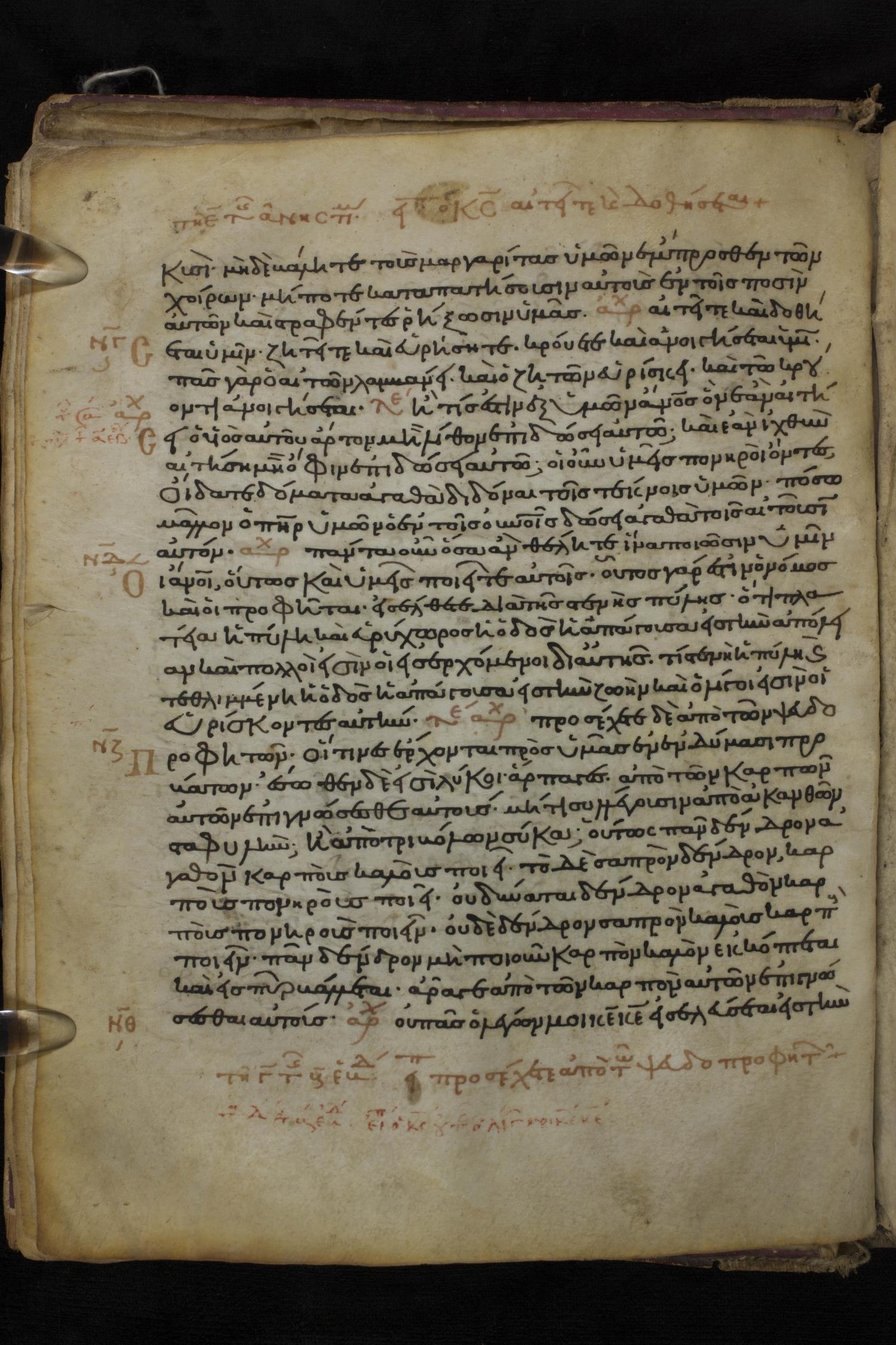 Twelfth century minuscule of the Gospels on parchment; 150 leaves, 1 column, 27 lines per column. Images were taken at the National Library of Greece in Athens.
