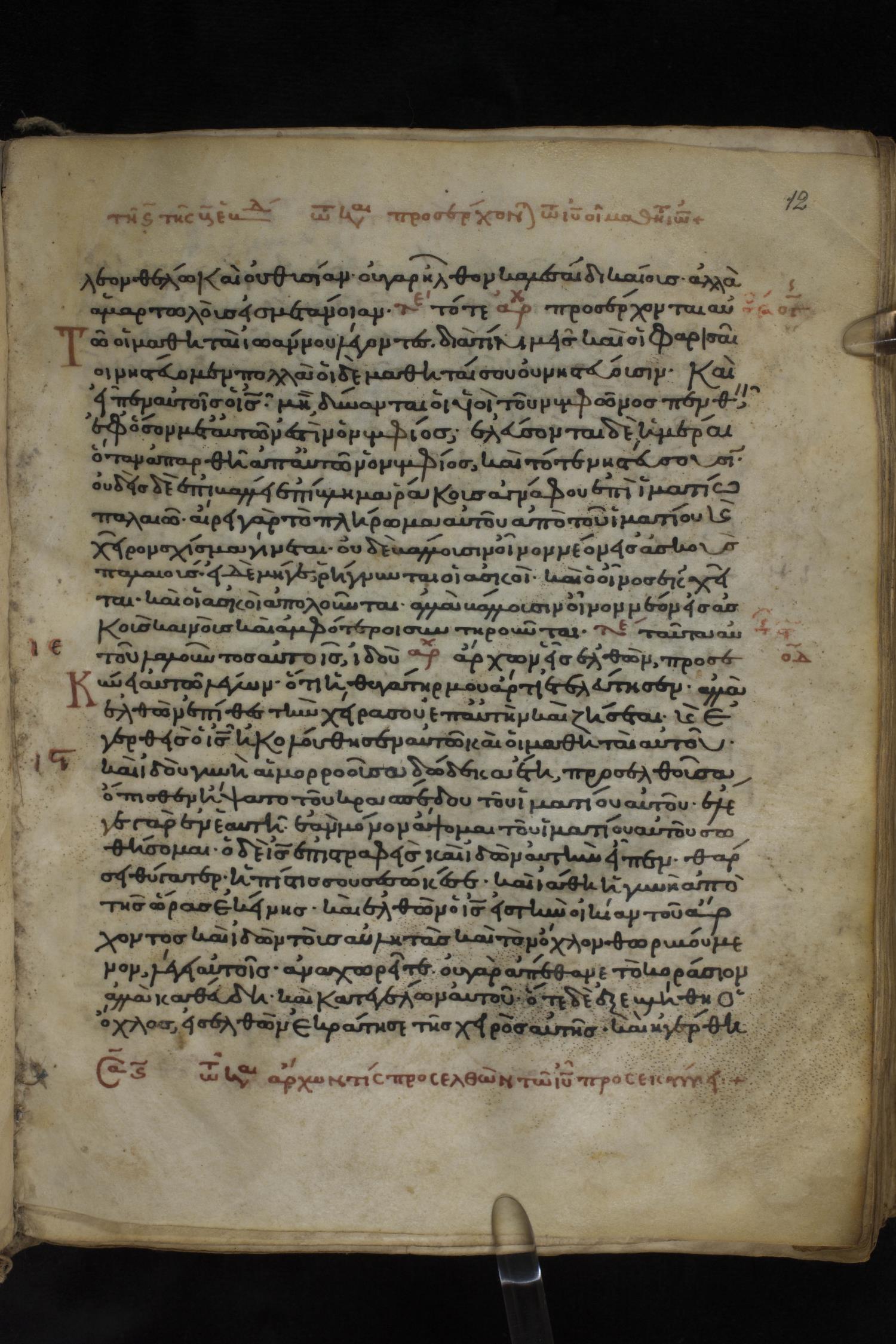 Twelfth century minuscule of the Gospels on parchment; 150 leaves, 1 column, 27 lines per column. Images were taken at the National Library of Greece in Athens.
