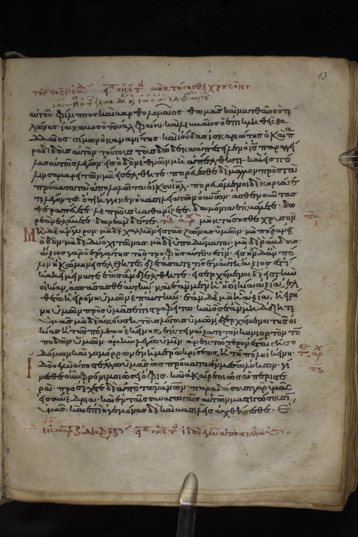 Twelfth century minuscule of the Gospels on parchment; 150 leaves, 1 column, 27 lines per column. Images were taken at the National Library of Greece in Athens.