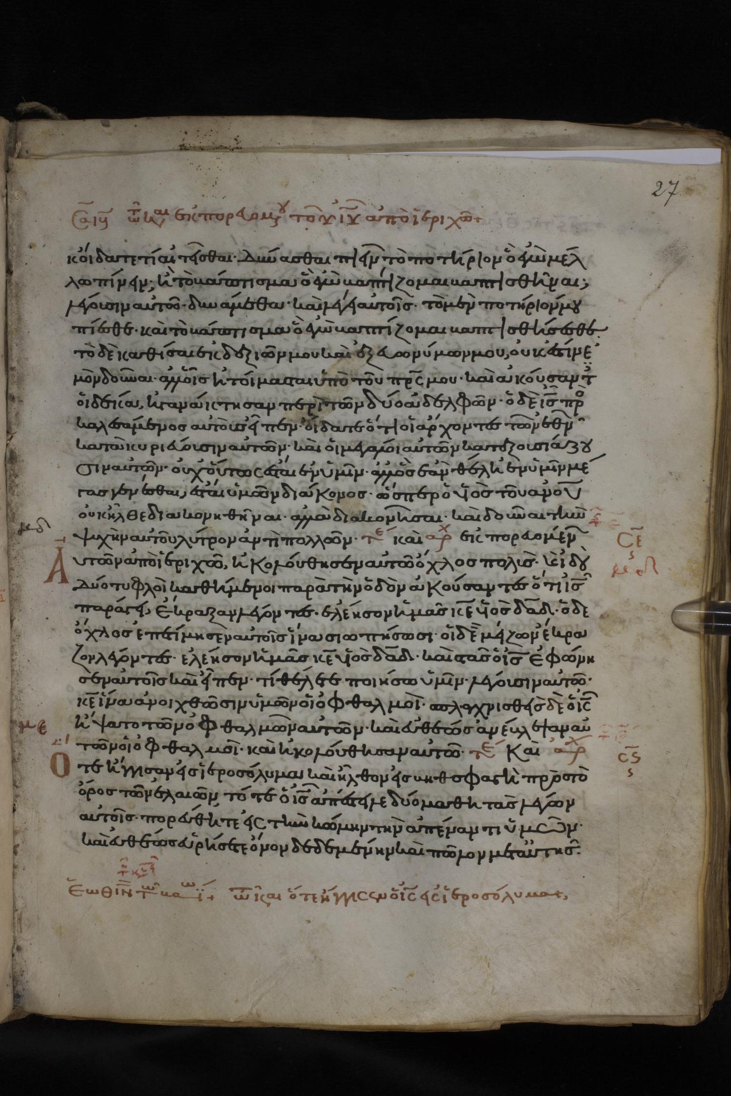 Twelfth century minuscule of the Gospels on parchment; 150 leaves, 1 column, 27 lines per column. Images were taken at the National Library of Greece in Athens.