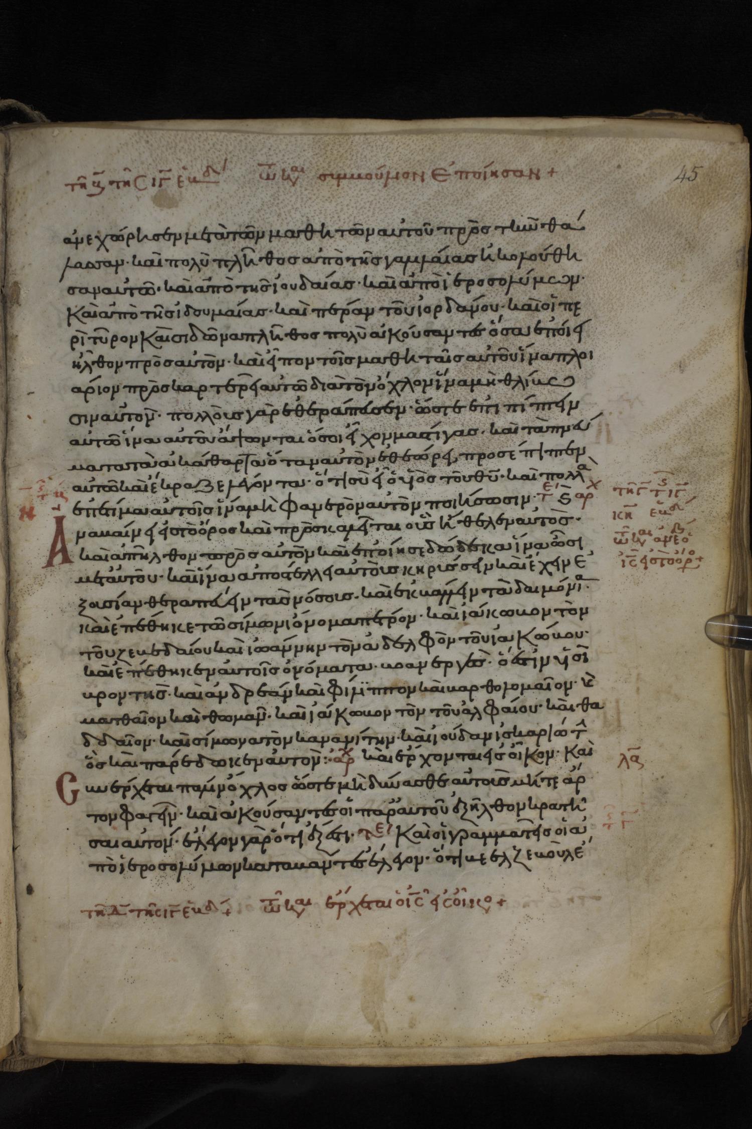 Twelfth century minuscule of the Gospels on parchment; 150 leaves, 1 column, 27 lines per column. Images were taken at the National Library of Greece in Athens.