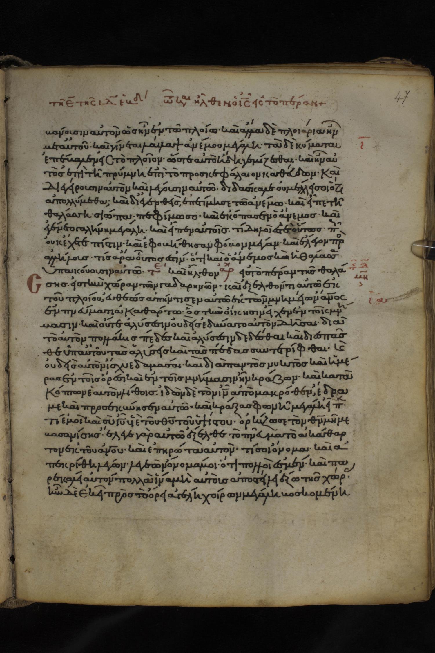 Twelfth century minuscule of the Gospels on parchment; 150 leaves, 1 column, 27 lines per column. Images were taken at the National Library of Greece in Athens.
