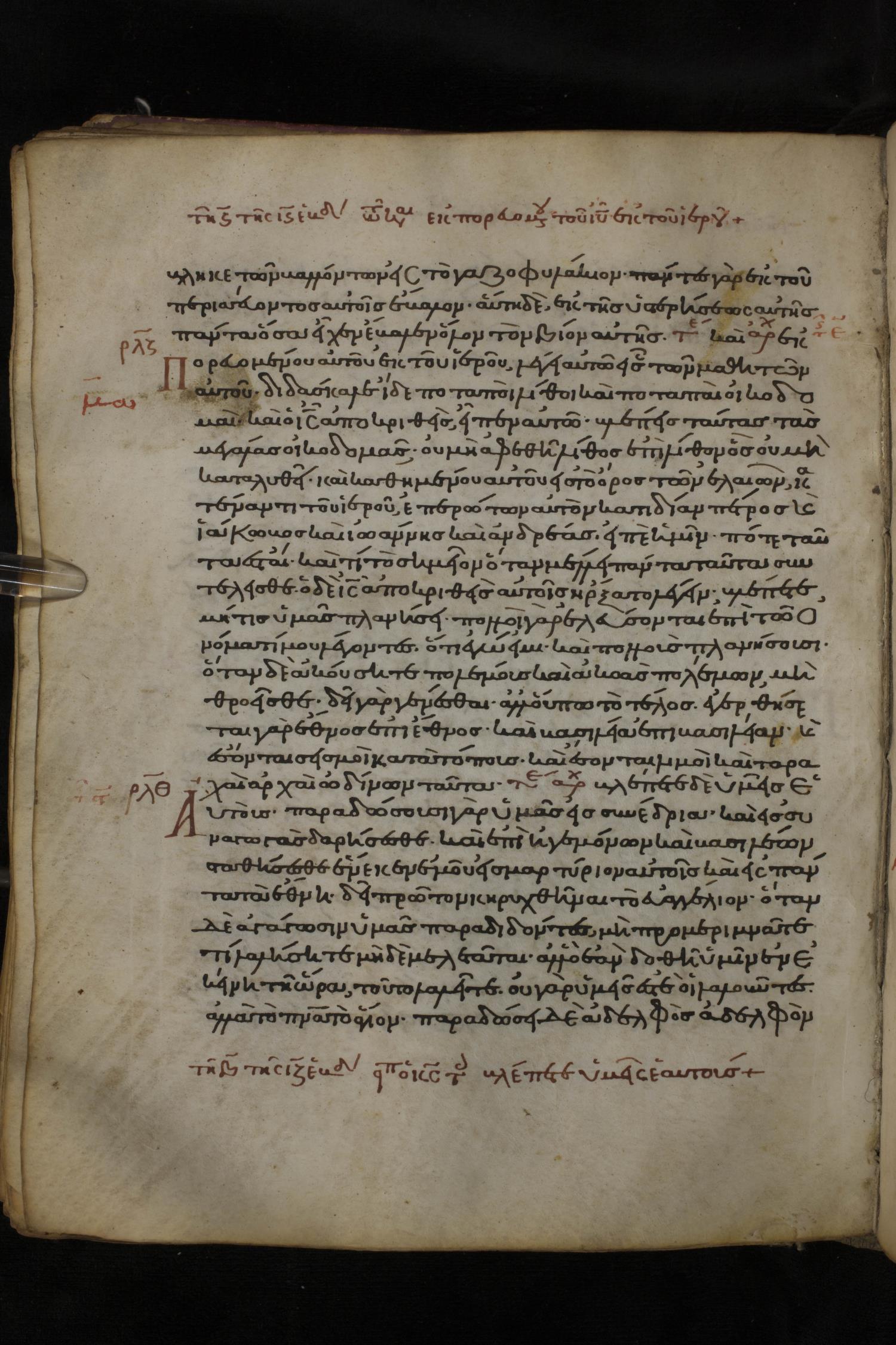 Twelfth century minuscule of the Gospels on parchment; 150 leaves, 1 column, 27 lines per column. Images were taken at the National Library of Greece in Athens.