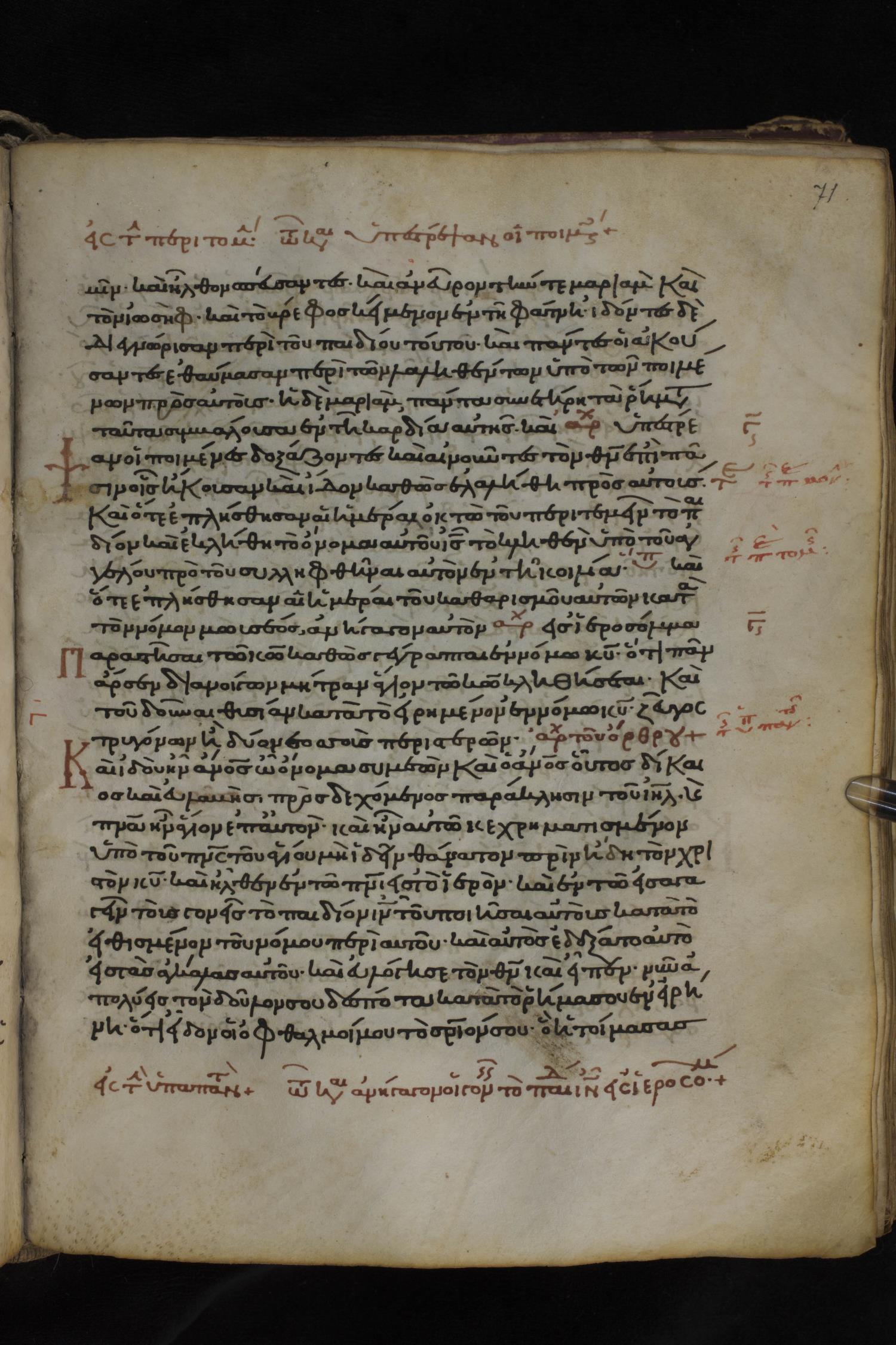 Twelfth century minuscule of the Gospels on parchment; 150 leaves, 1 column, 27 lines per column. Images were taken at the National Library of Greece in Athens.