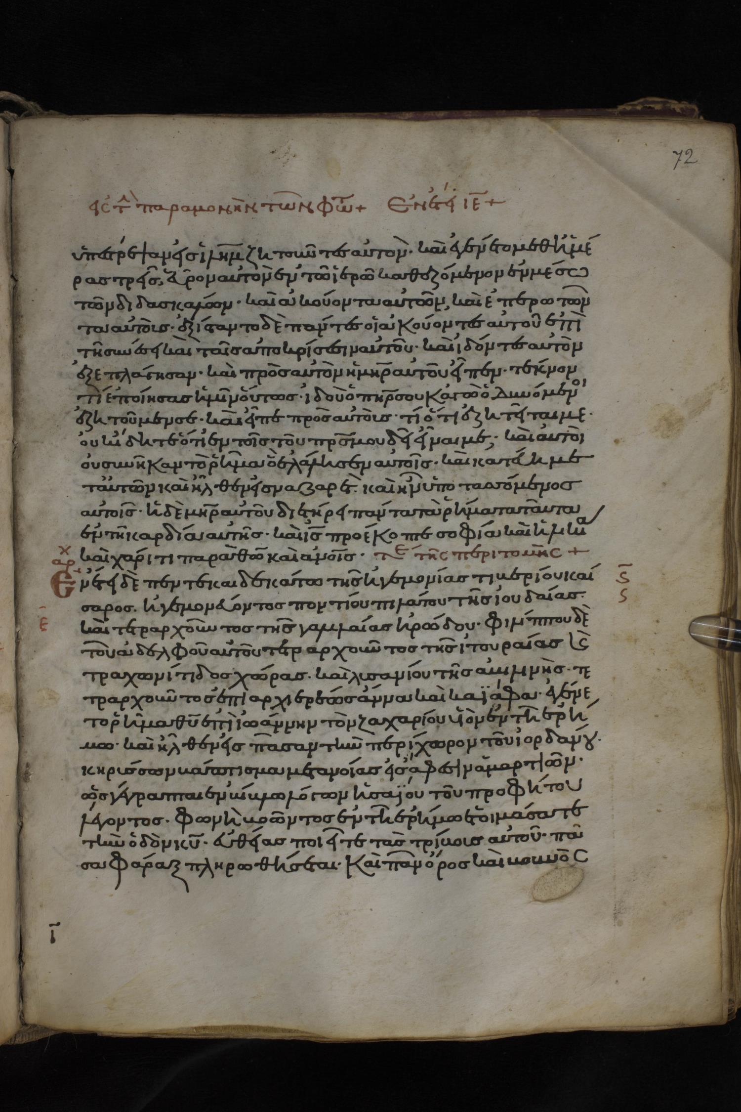 Twelfth century minuscule of the Gospels on parchment; 150 leaves, 1 column, 27 lines per column. Images were taken at the National Library of Greece in Athens.