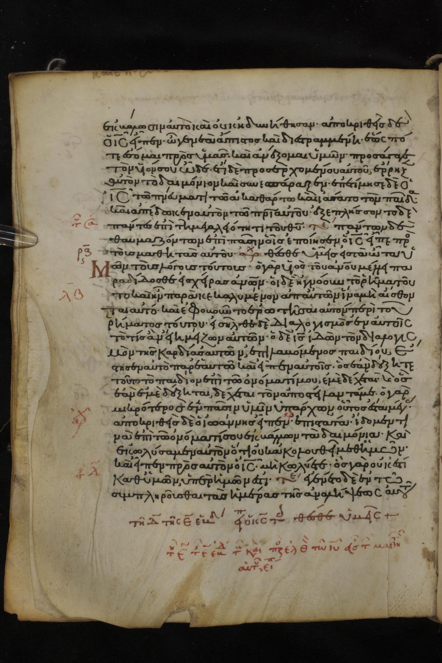 Twelfth century minuscule of the Gospels on parchment; 150 leaves, 1 column, 27 lines per column. Images were taken at the National Library of Greece in Athens.