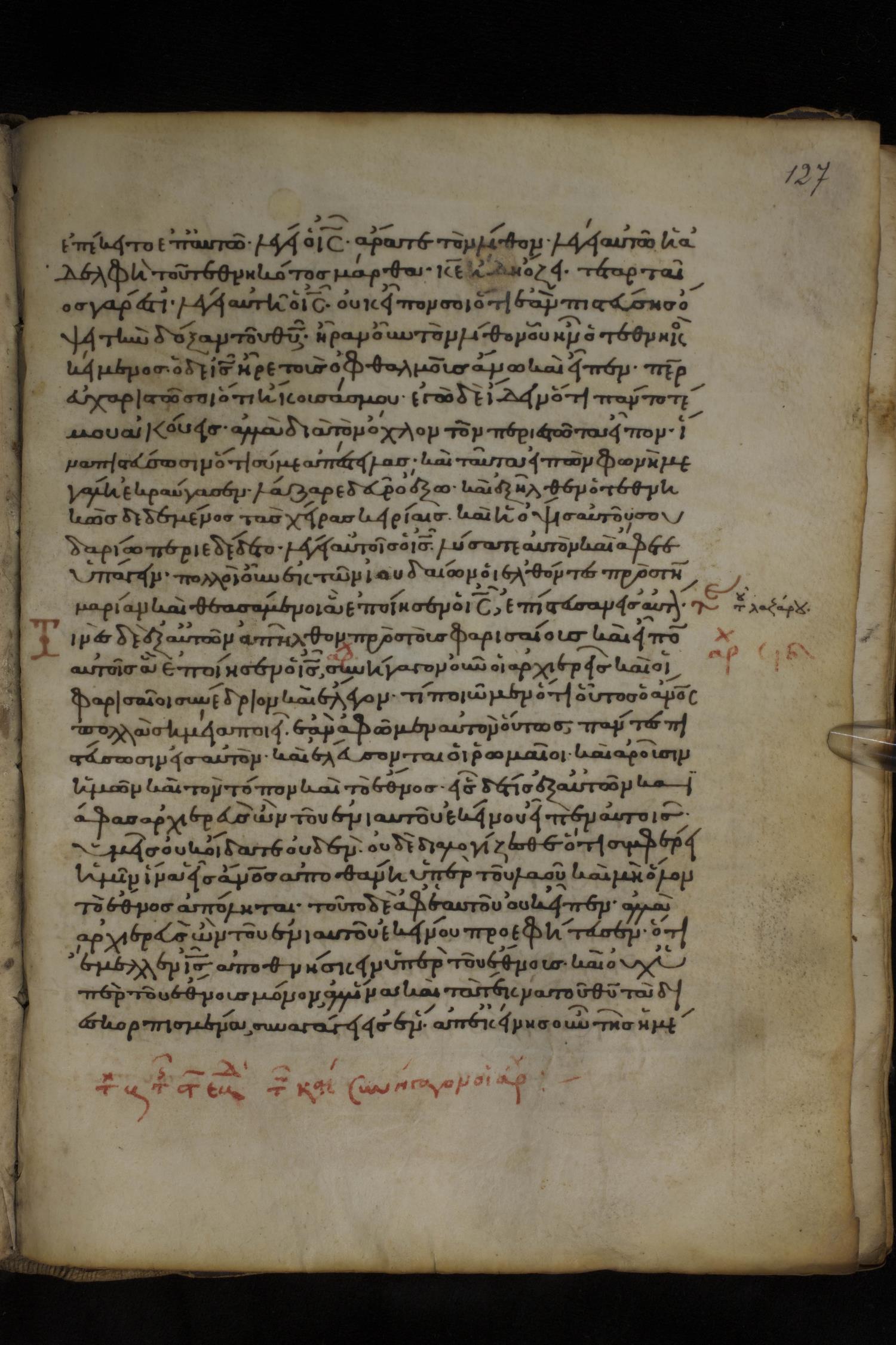 Twelfth century minuscule of the Gospels on parchment; 150 leaves, 1 column, 27 lines per column. Images were taken at the National Library of Greece in Athens.