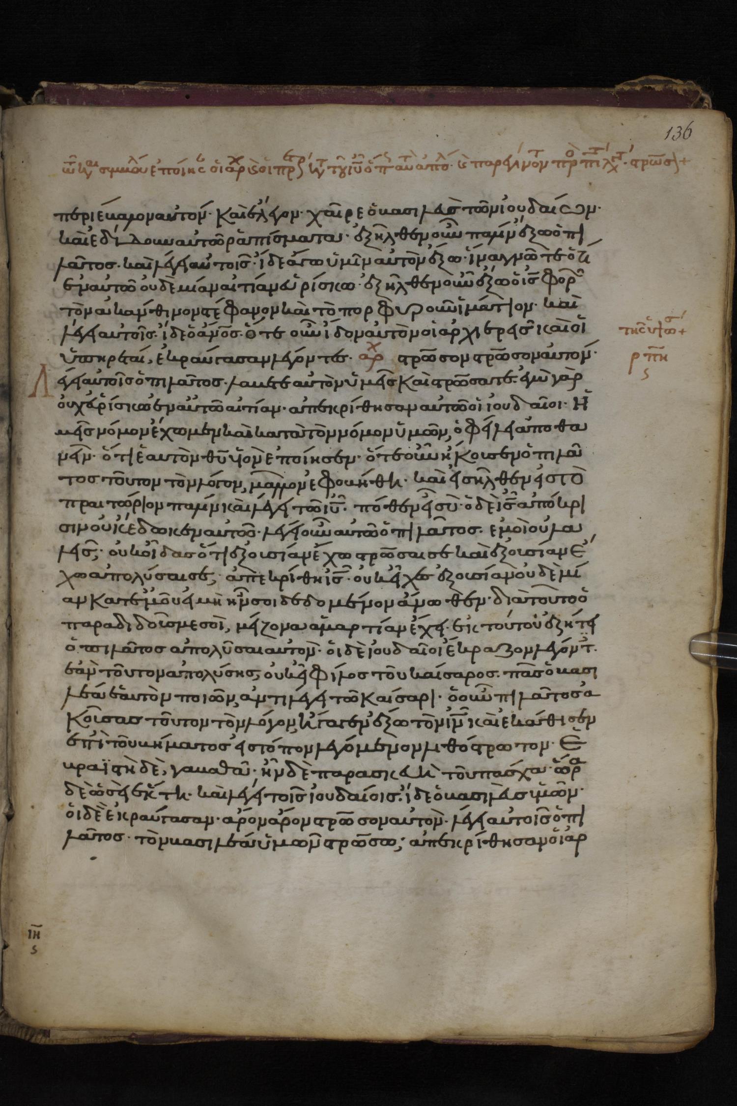 Twelfth century minuscule of the Gospels on parchment; 150 leaves, 1 column, 27 lines per column. Images were taken at the National Library of Greece in Athens.
