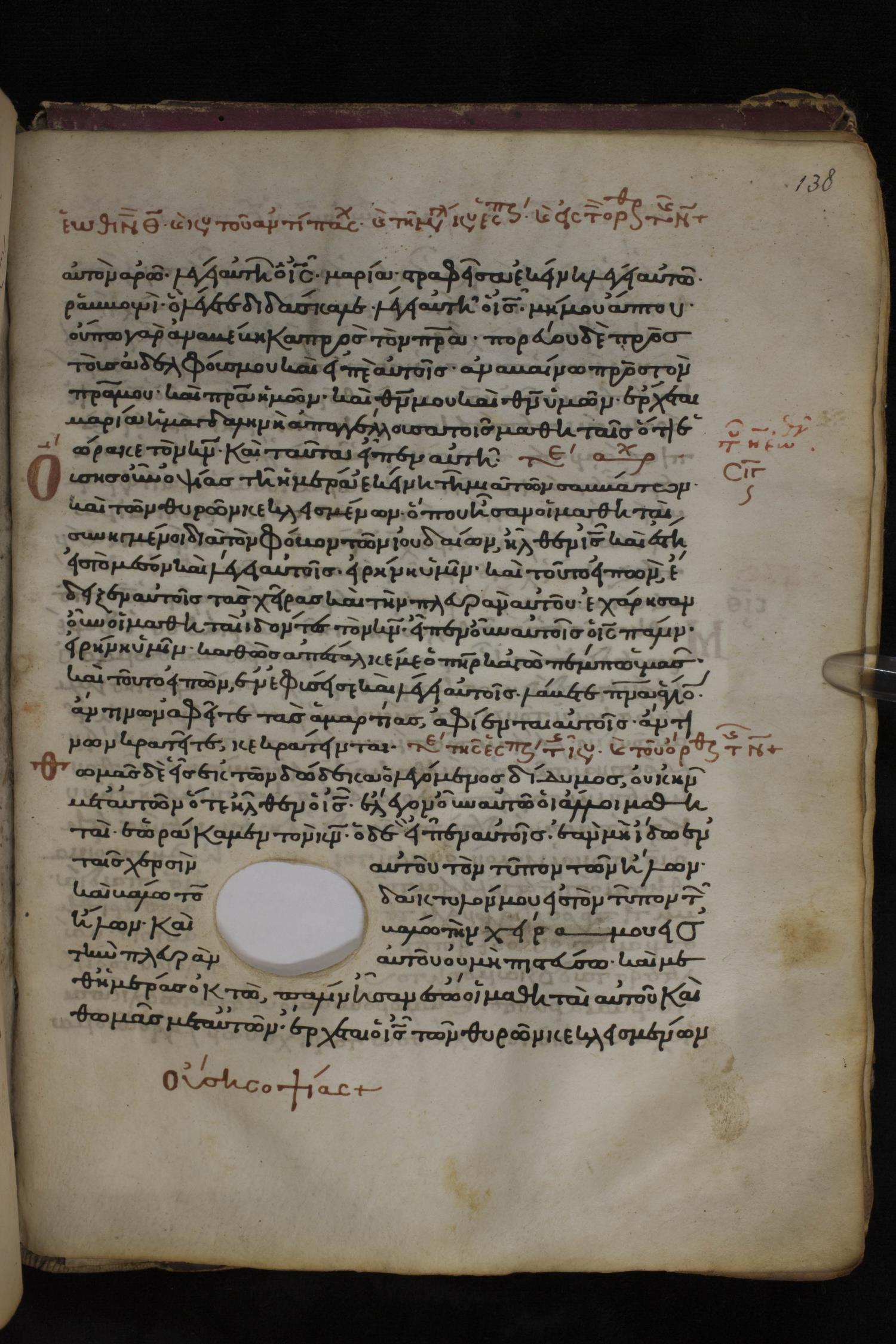 Twelfth century minuscule of the Gospels on parchment; 150 leaves, 1 column, 27 lines per column. Images were taken at the National Library of Greece in Athens.