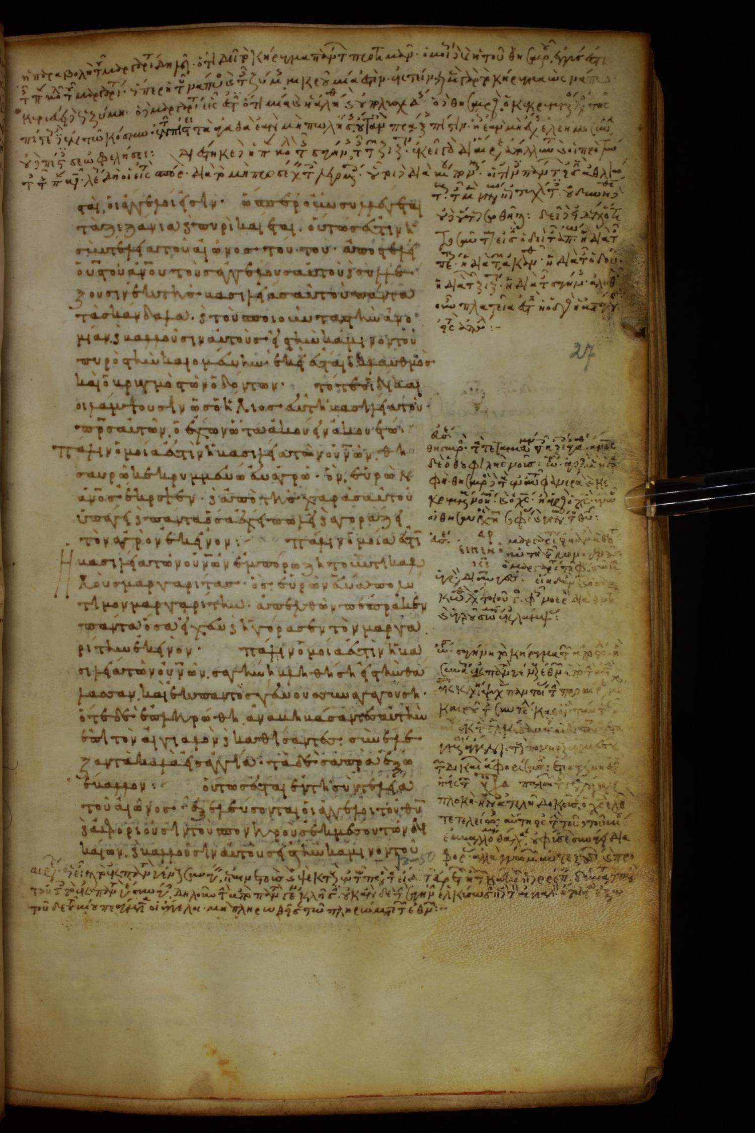 Ninth or tenth century minuscule of the Gospels, Apostolos, Paul, and Revelation (complete New Testament) with commentary on parchment; 337 leaves, single column, 29–33 lines per column.