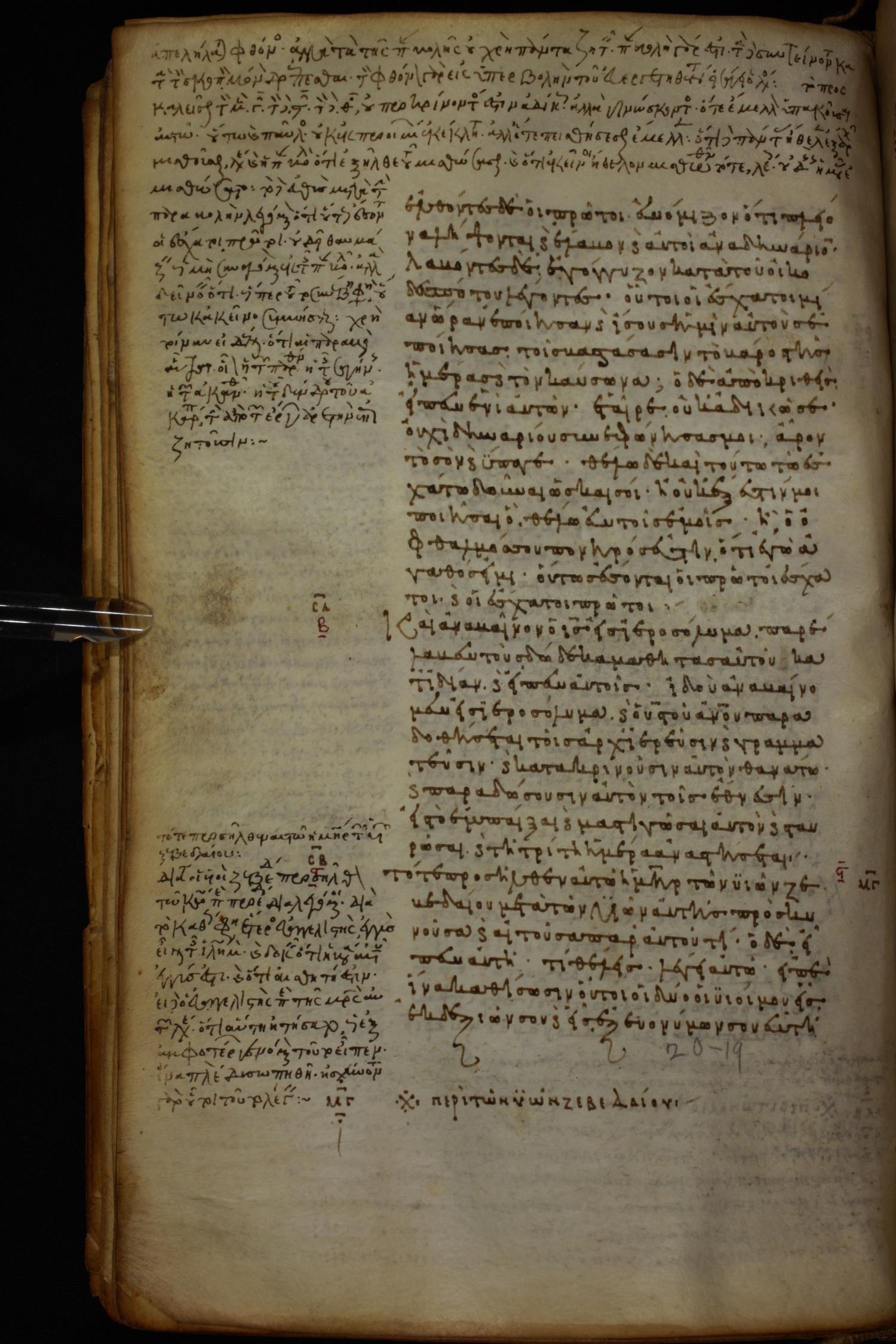 Ninth or tenth century minuscule of the Gospels, Apostolos, Paul, and Revelation (complete New Testament) with commentary on parchment; 337 leaves, single column, 29–33 lines per column.