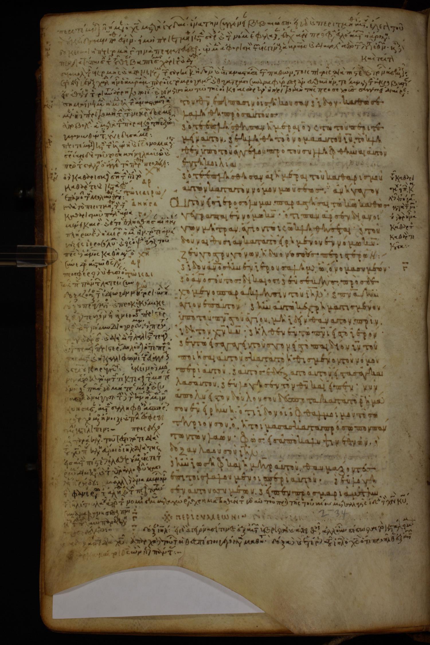 Ninth or tenth century minuscule of the Gospels, Apostolos, Paul, and Revelation (complete New Testament) with commentary on parchment; 337 leaves, single column, 29–33 lines per column.