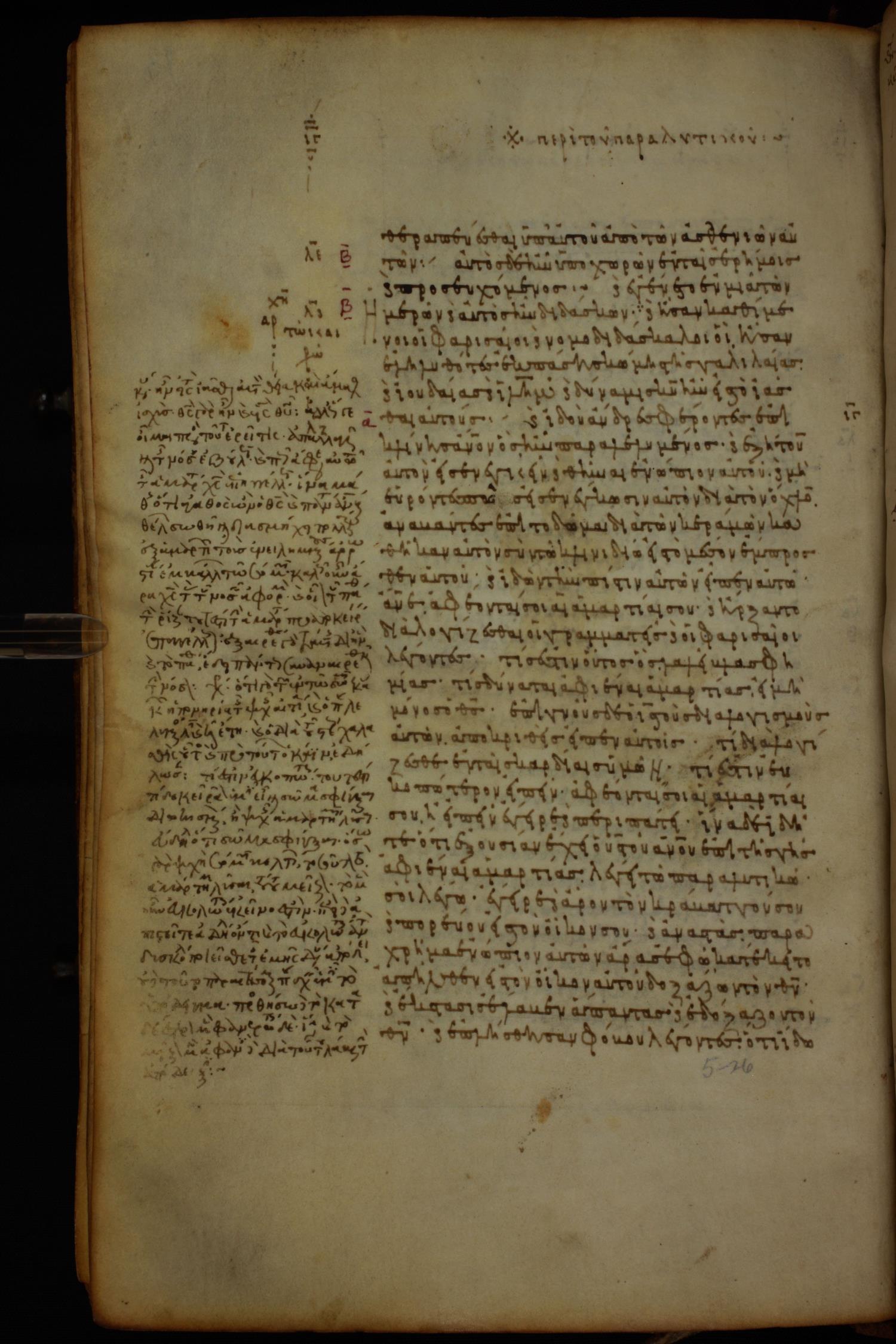 Ninth or tenth century minuscule of the Gospels, Apostolos, Paul, and Revelation (complete New Testament) with commentary on parchment; 337 leaves, single column, 29–33 lines per column.