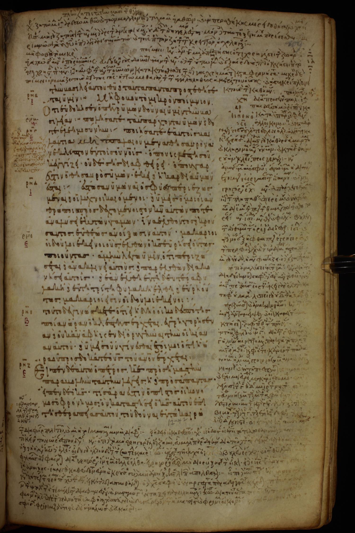 Ninth or tenth century minuscule of the Gospels, Apostolos, Paul, and Revelation (complete New Testament) with commentary on parchment; 337 leaves, single column, 29–33 lines per column.