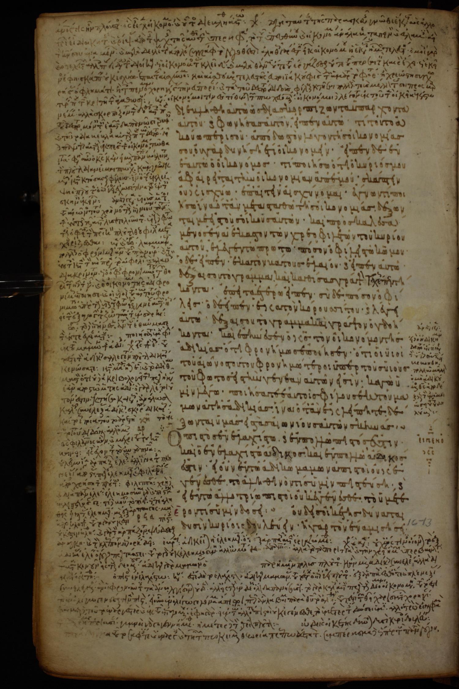Ninth or tenth century minuscule of the Gospels, Apostolos, Paul, and Revelation (complete New Testament) with commentary on parchment; 337 leaves, single column, 29–33 lines per column.