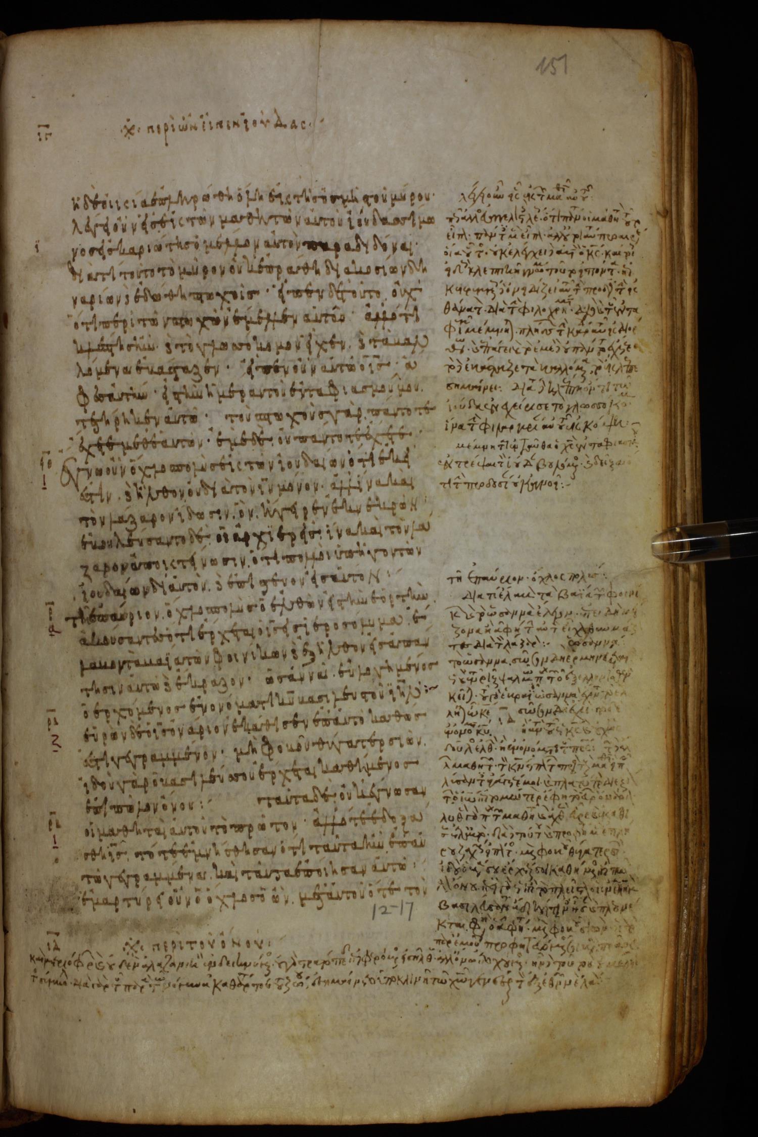 Ninth or tenth century minuscule of the Gospels, Apostolos, Paul, and Revelation (complete New Testament) with commentary on parchment; 337 leaves, single column, 29–33 lines per column.