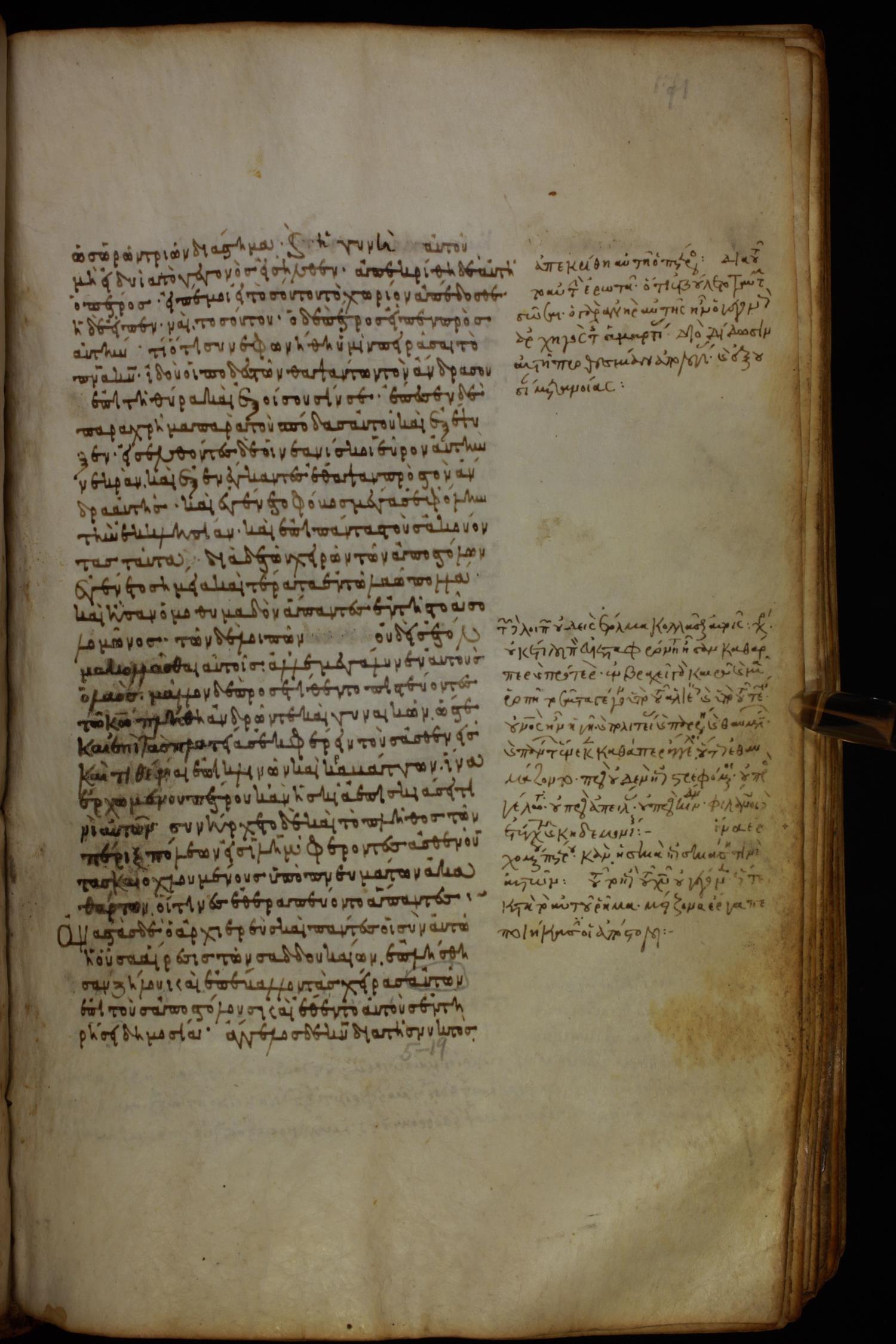 Ninth or tenth century minuscule of the Gospels, Apostolos, Paul, and Revelation (complete New Testament) with commentary on parchment; 337 leaves, single column, 29–33 lines per column.