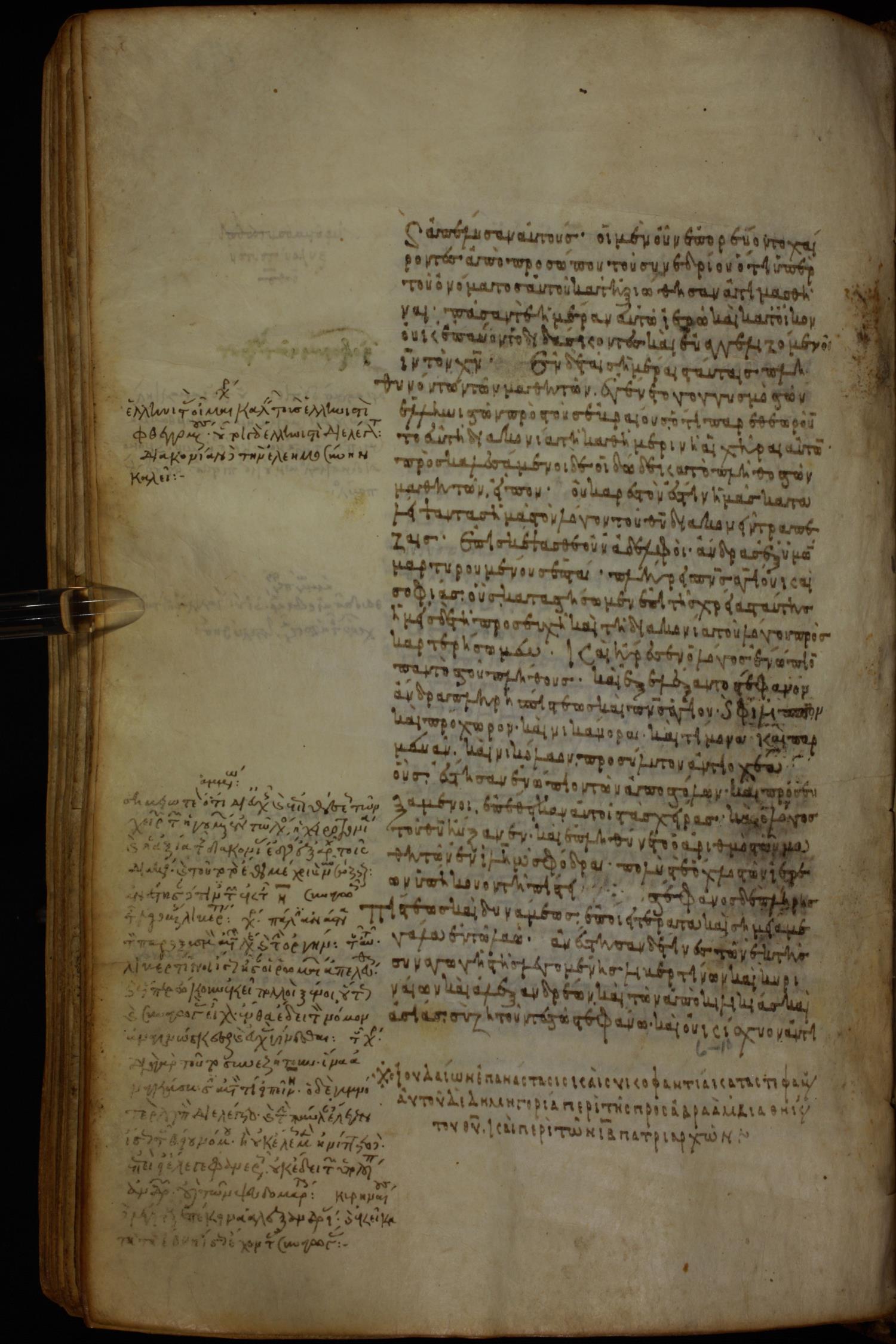Ninth or tenth century minuscule of the Gospels, Apostolos, Paul, and Revelation (complete New Testament) with commentary on parchment; 337 leaves, single column, 29–33 lines per column.