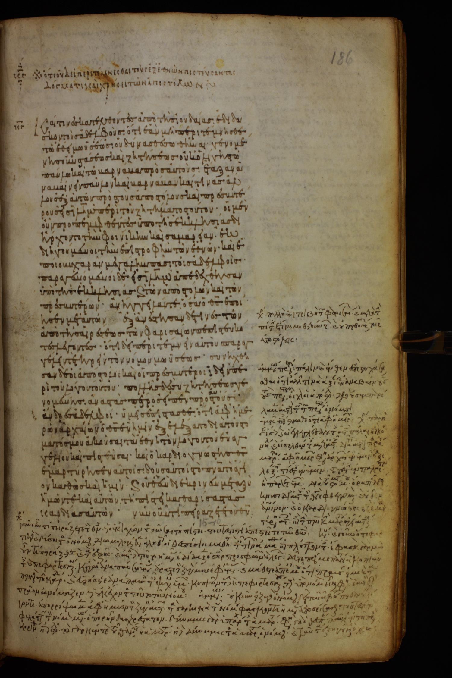 Ninth or tenth century minuscule of the Gospels, Apostolos, Paul, and Revelation (complete New Testament) with commentary on parchment; 337 leaves, single column, 29–33 lines per column.