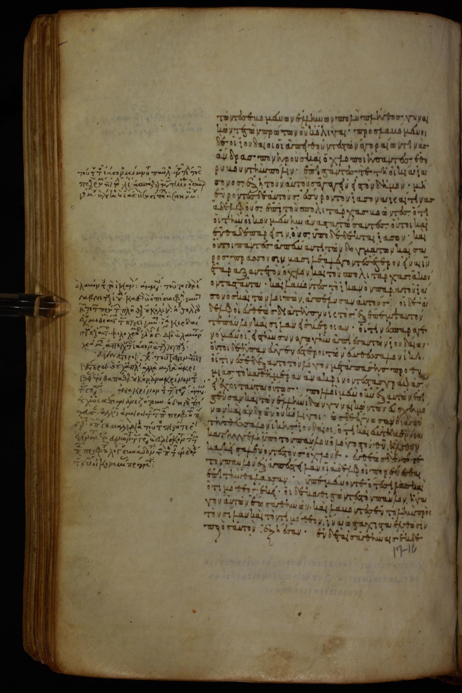 Ninth or tenth century minuscule of the Gospels, Apostolos, Paul, and Revelation (complete New Testament) with commentary on parchment; 337 leaves, single column, 29–33 lines per column.