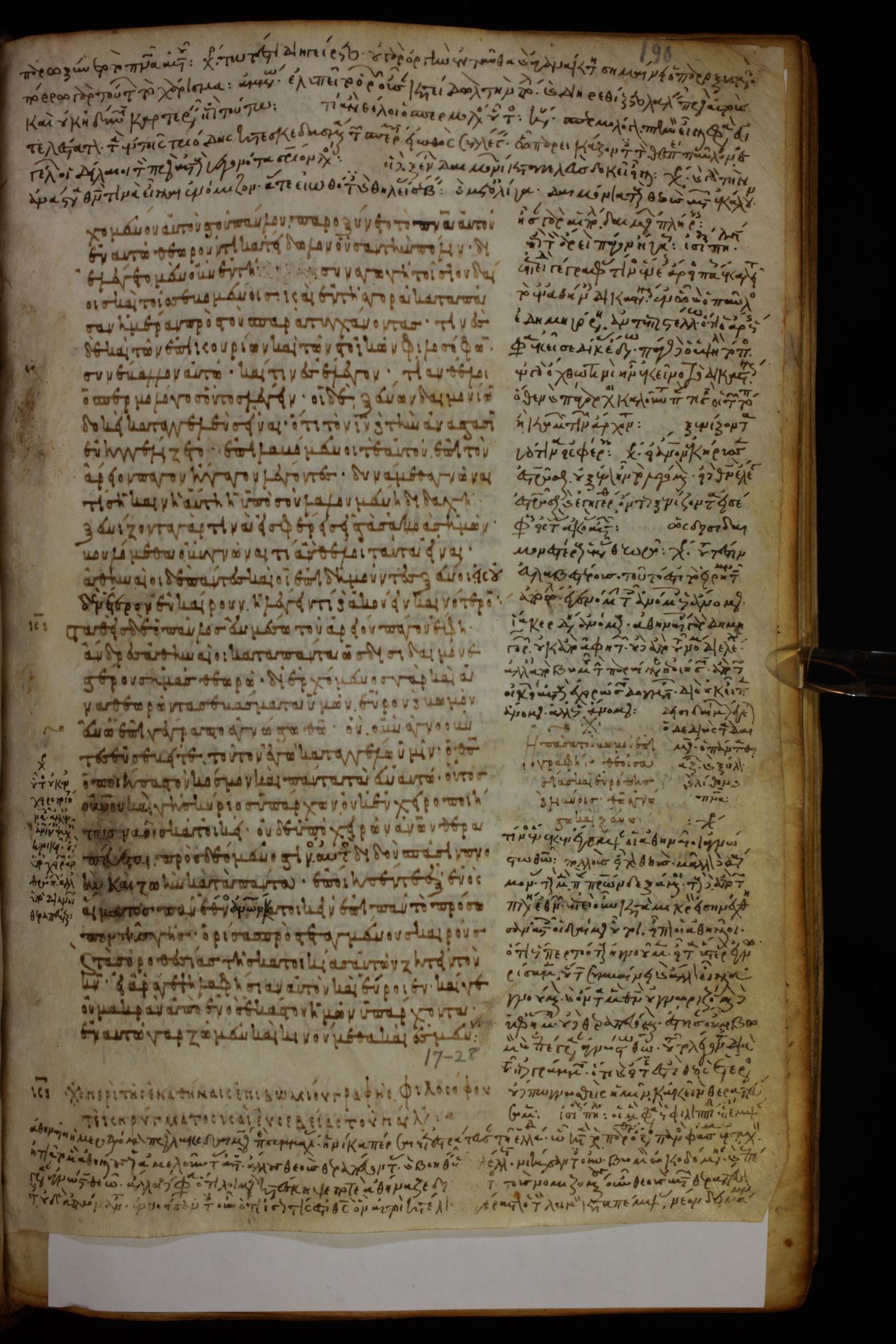 Ninth or tenth century minuscule of the Gospels, Apostolos, Paul, and Revelation (complete New Testament) with commentary on parchment; 337 leaves, single column, 29–33 lines per column.