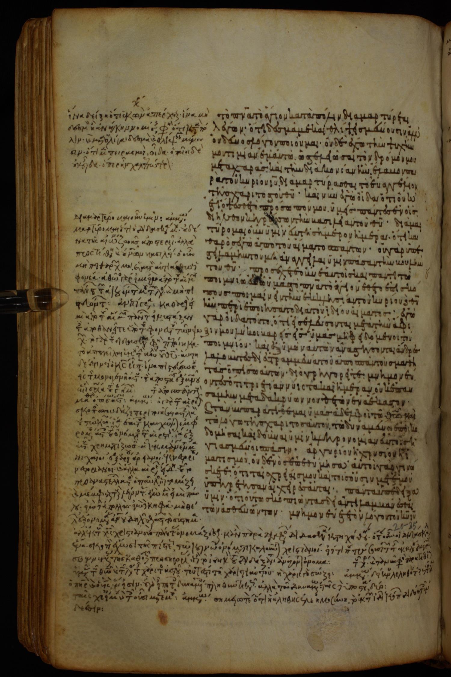 Ninth or tenth century minuscule of the Gospels, Apostolos, Paul, and Revelation (complete New Testament) with commentary on parchment; 337 leaves, single column, 29–33 lines per column.
