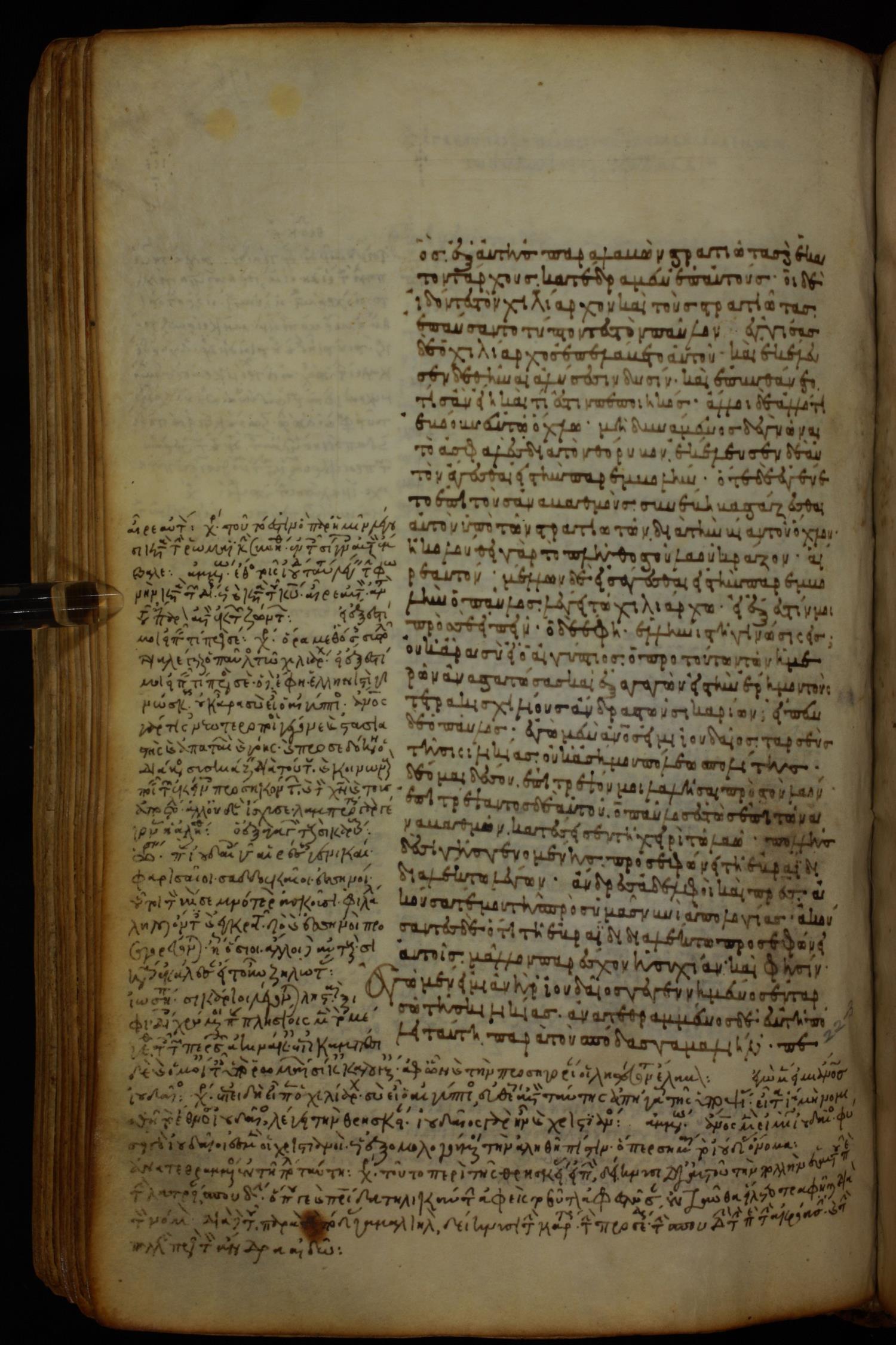 Ninth or tenth century minuscule of the Gospels, Apostolos, Paul, and Revelation (complete New Testament) with commentary on parchment; 337 leaves, single column, 29–33 lines per column.